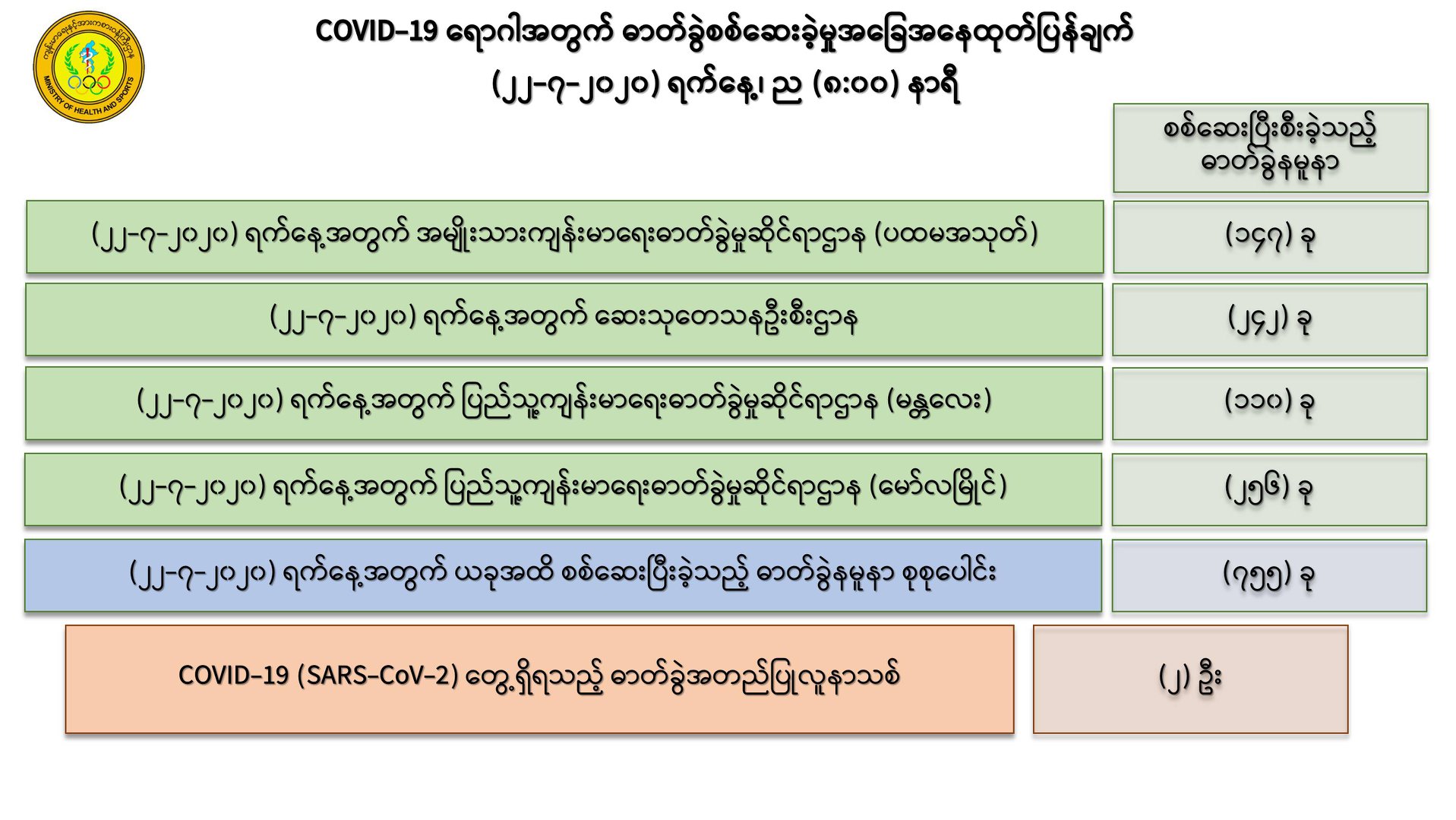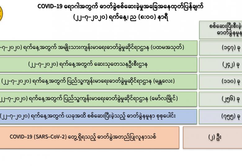 ၁။ (၂၂-၇-၂၀၂၀) ရက်နေ့အတွက် COVID-19 ရောဂါ ဓာတ်ခွဲစစ်ဆေးရာတွင် -