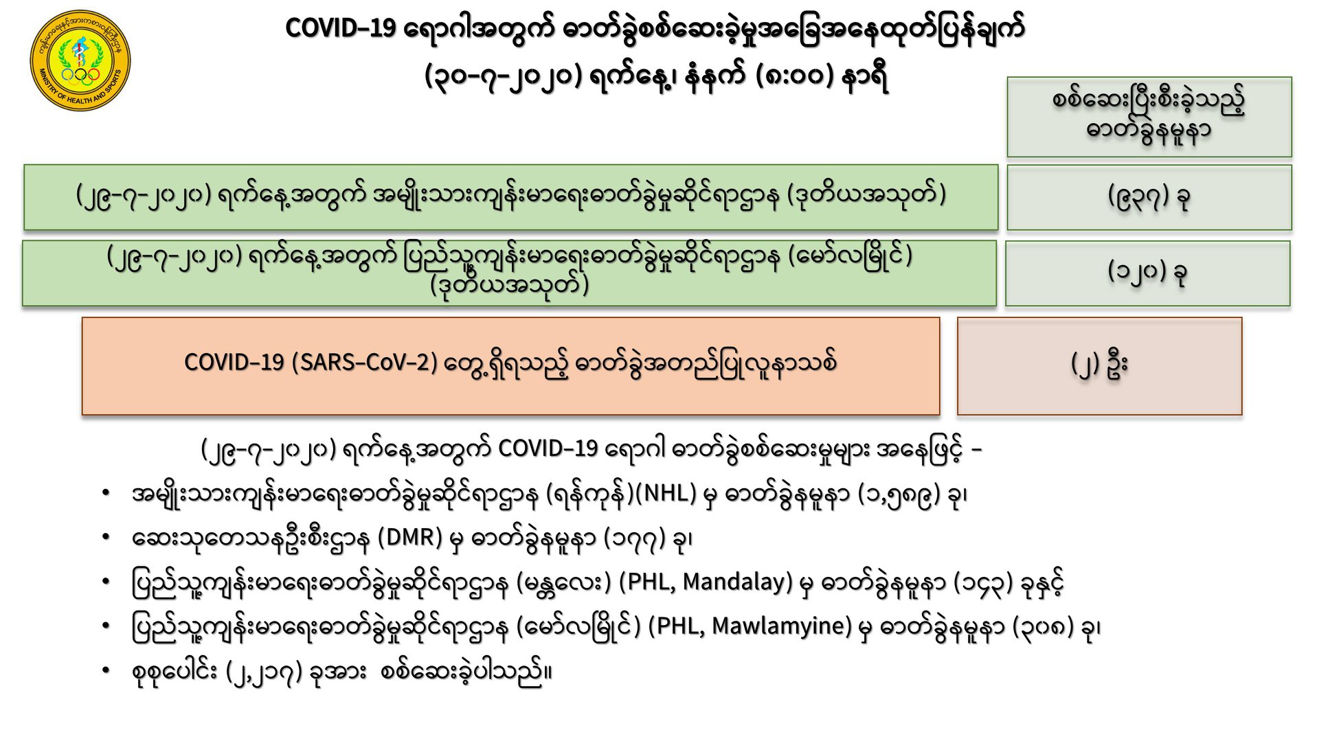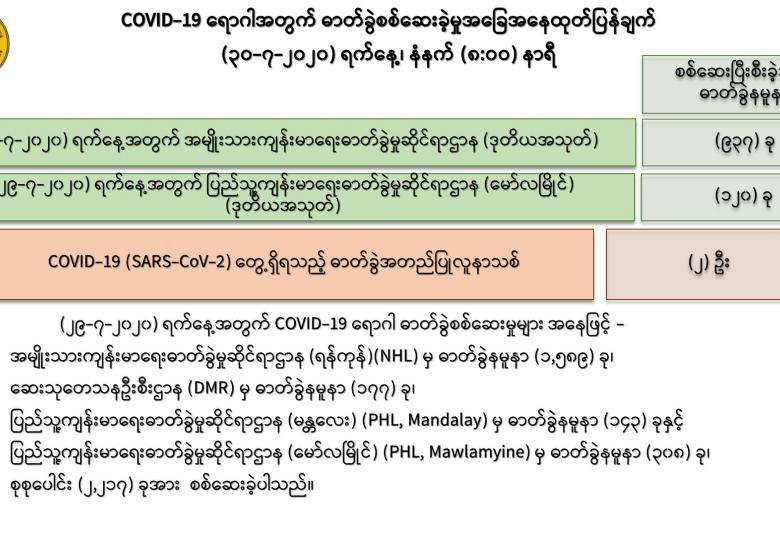 ၁။ (၂၉-၇-၂၀၂၀) ရက်နေ့အတွက် COVID-19 ရောဂါ ဓာတ်ခွဲစစ်ဆေးရာတွင် -