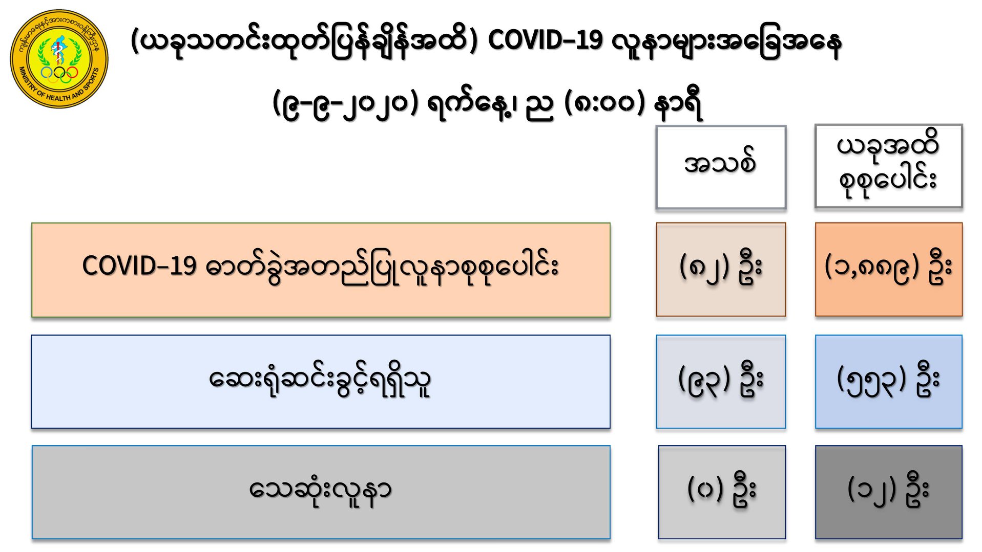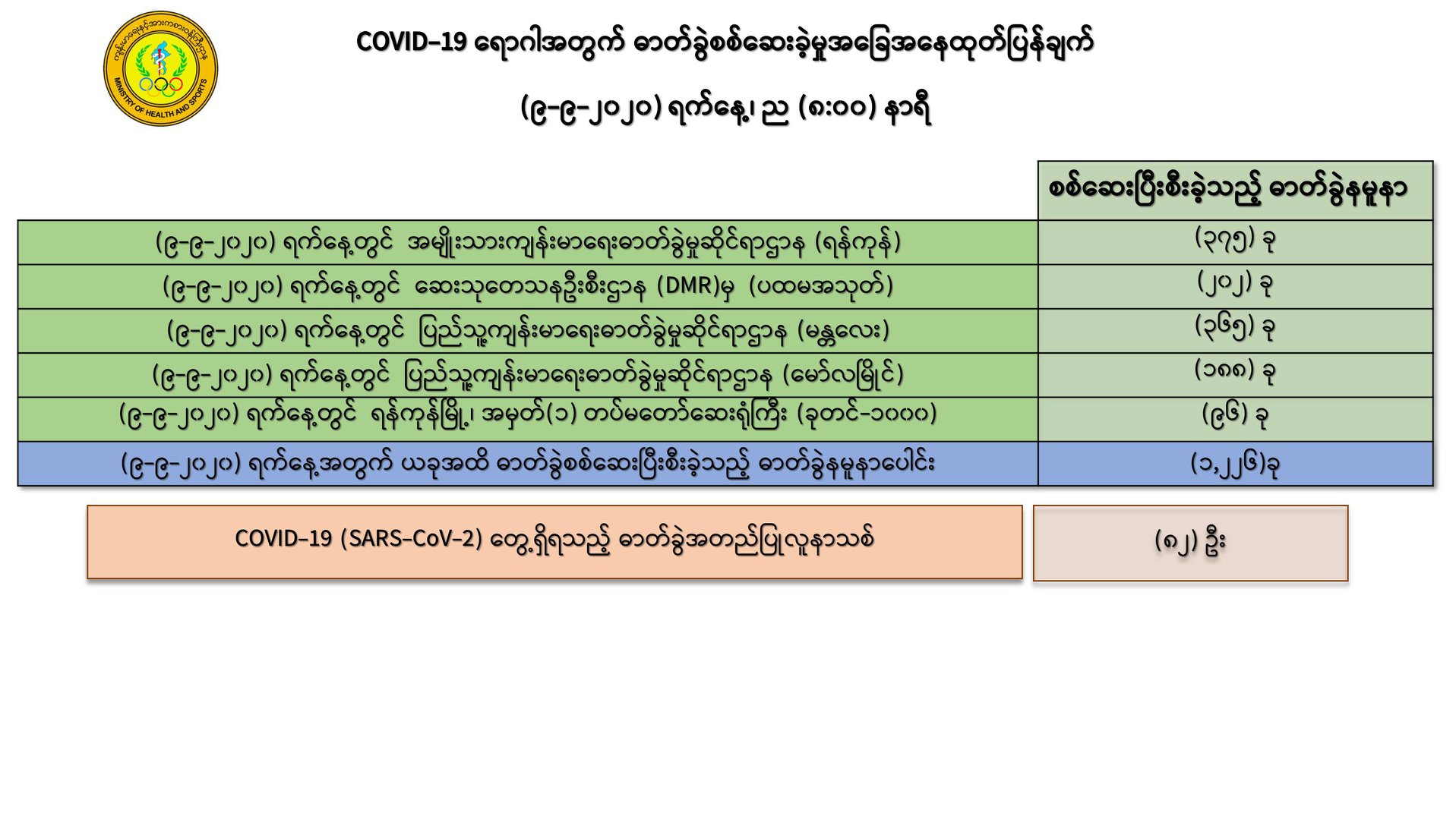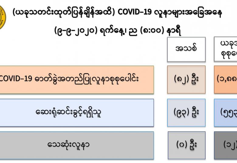 ၁။ (၉-၉ -၂၀၂၀) ရက်နေ့အတွက် COVID-19 ရောဂါ ဓာတ်ခွဲစစ်ဆေးရာတွင် -
