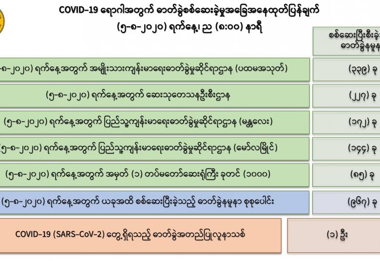 ၁။ (၅-၈-၂၀၂၀) ရက်နေ့အတွက် COVID-19 ရောဂါ ဓာတ်ခွဲစစ်ဆေးရာတွင် -