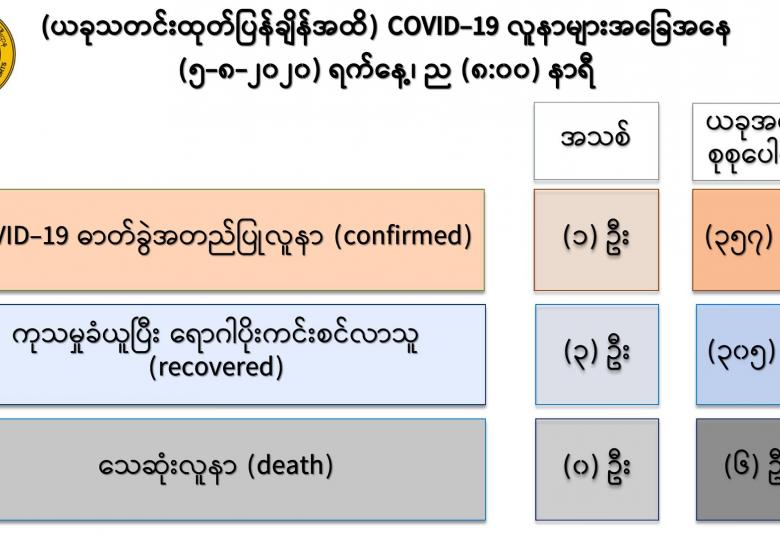 ၂။ (၅-၈-၂၀၂၀) ရက်နေ့၊ ည (၈:၀၀)နာရီအထိ မြန်မာနိုင်ငံတွင် COVID-19 ရောဂါဓာတ်ခွဲ အတည်ပြုလူနာ (၃၅၇) ဦးရှိပြီဖြစ်ပါသည်။