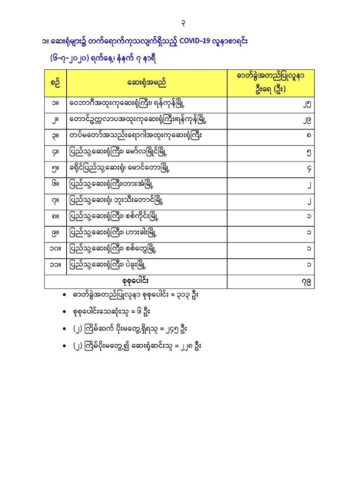 ၁။ ဆေးရုံများ၌ တက်ရောက်ကုသလျက်ရှိသည့် COVID-19 လူနာစာရင်း