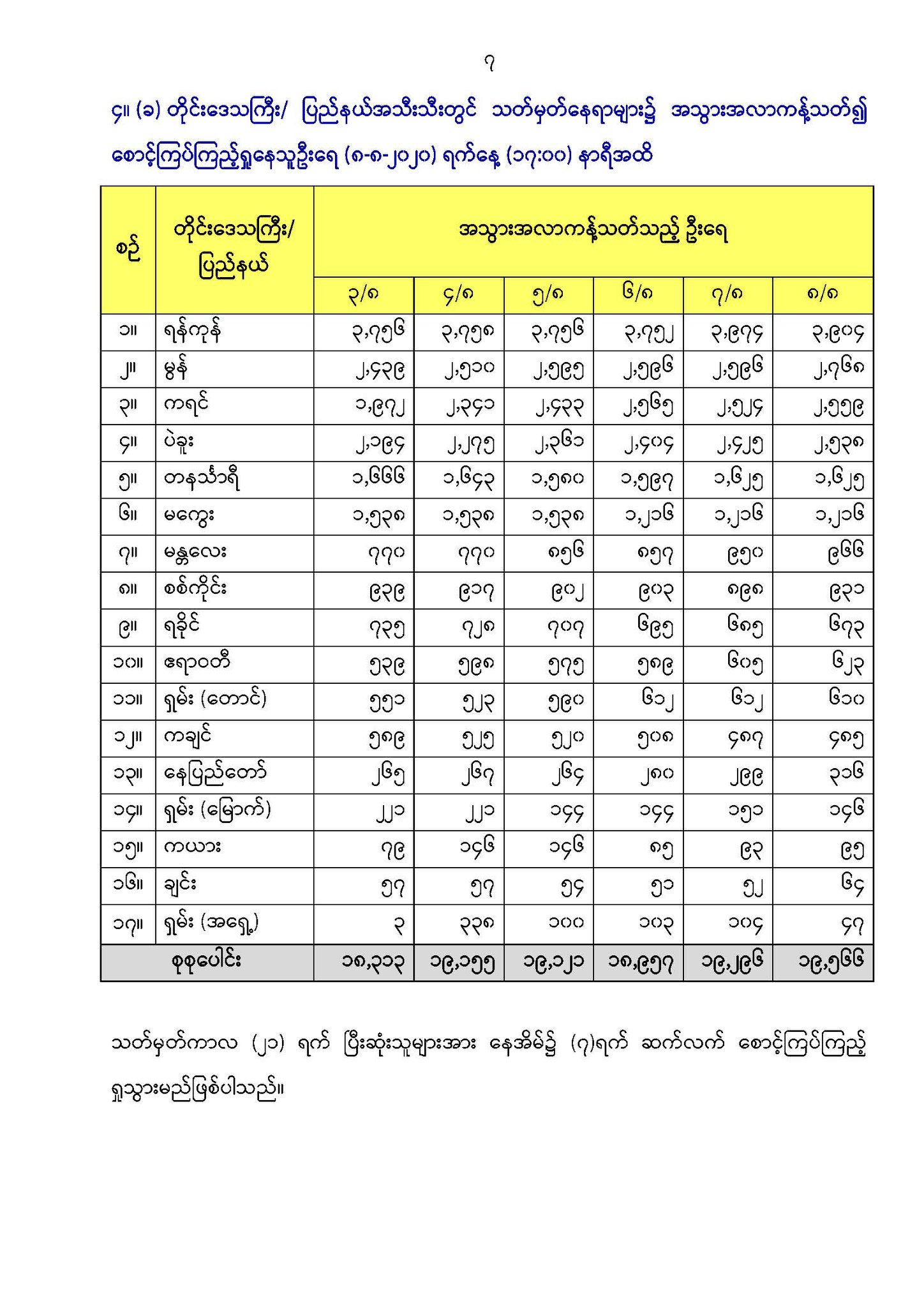 ၄။ (က) တိုင်းဒေသကြီး/ ပြည်နယ်အသီးသီးတွင် သတ်မှတ်နေရာများ၌ အသွားအလာ ကန့်သတ်၍ စောင့်ကြပ်ကြည့်ရှုသည့် နေရာအရေအတွက်