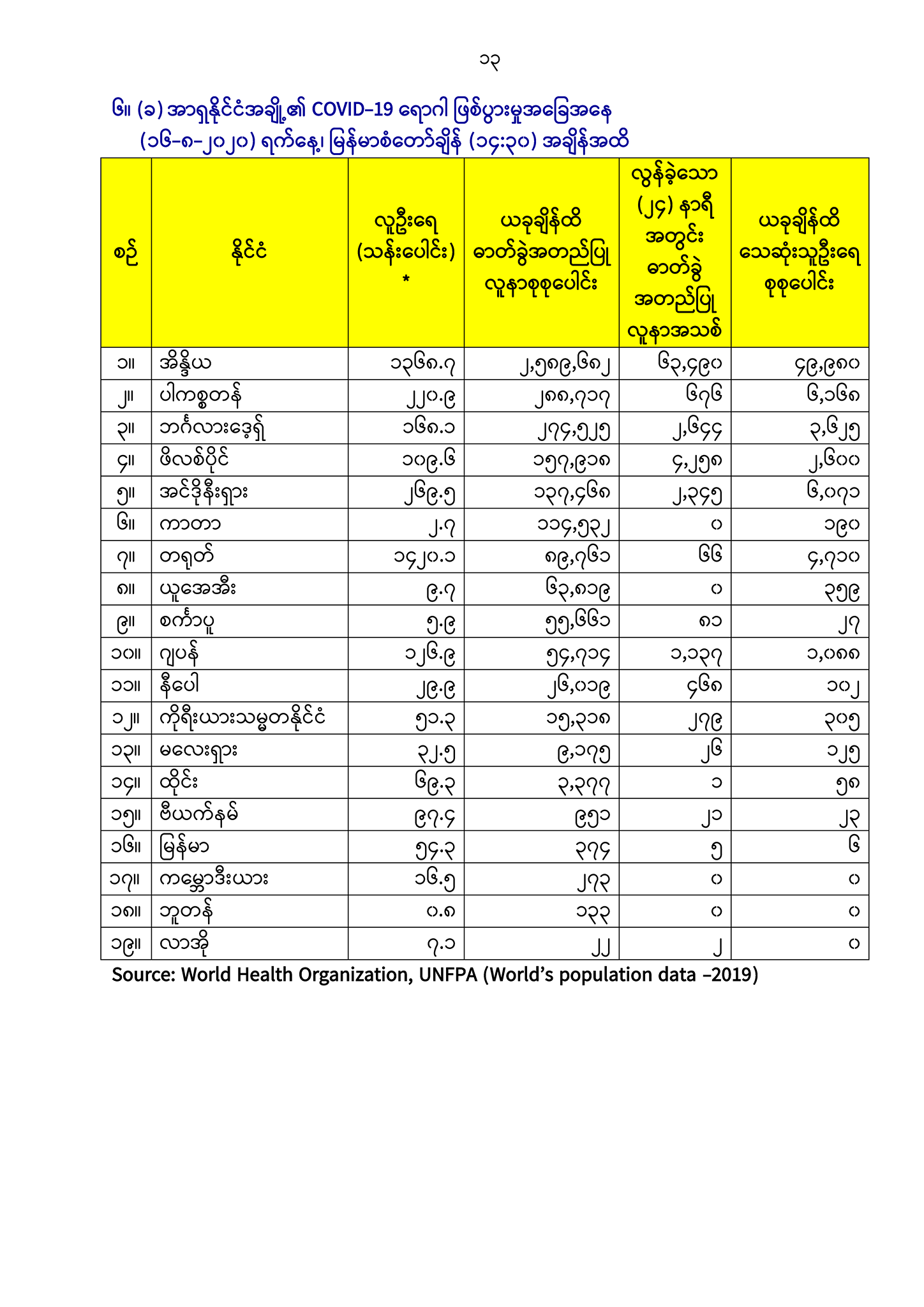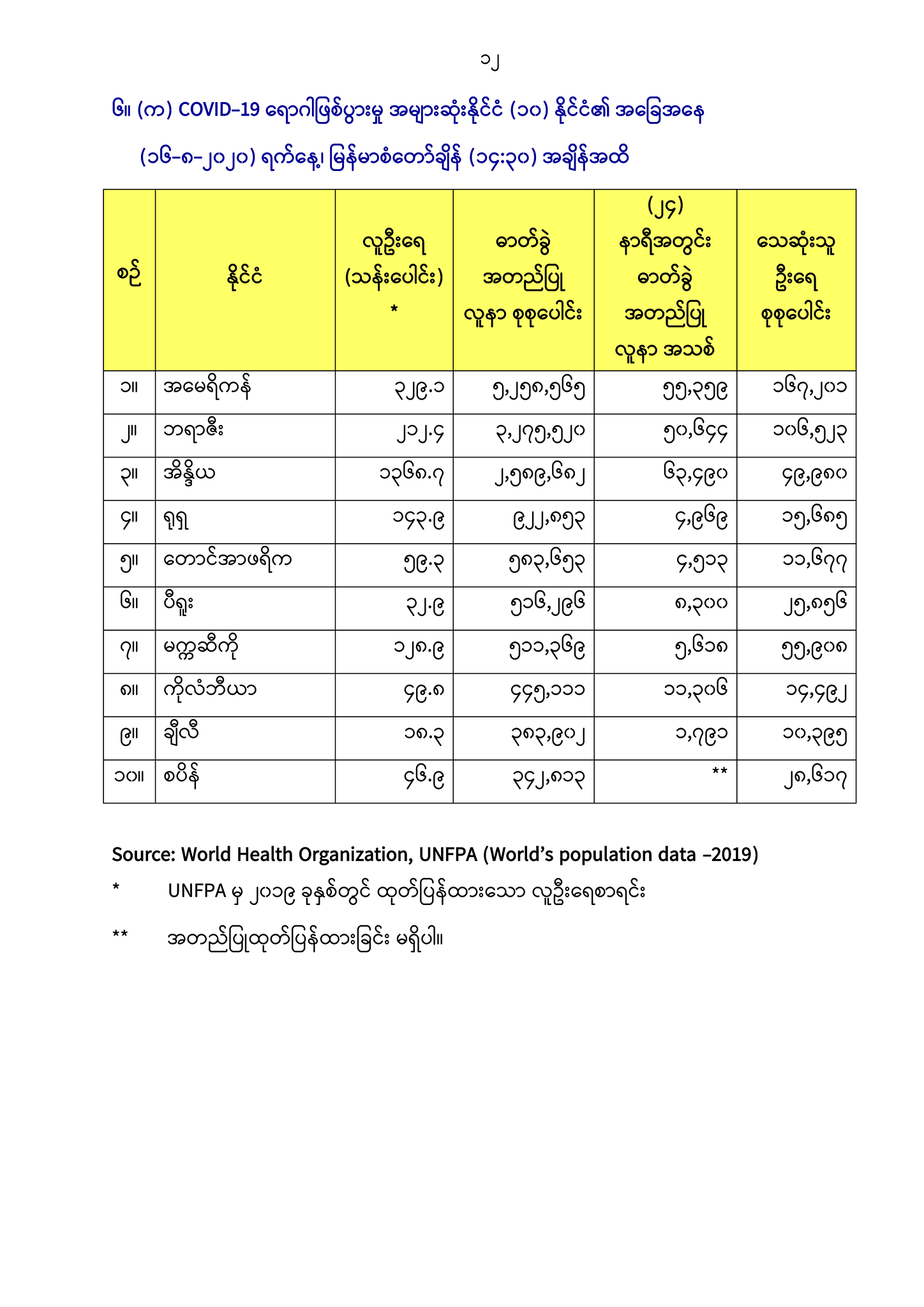 ၆။ (က) COVID-19 ရောဂါဖြစ်ပွားမှု အများဆုံးနိုင်ငံ (၁၀) နိုင်ငံ၏ အခြေအနေ