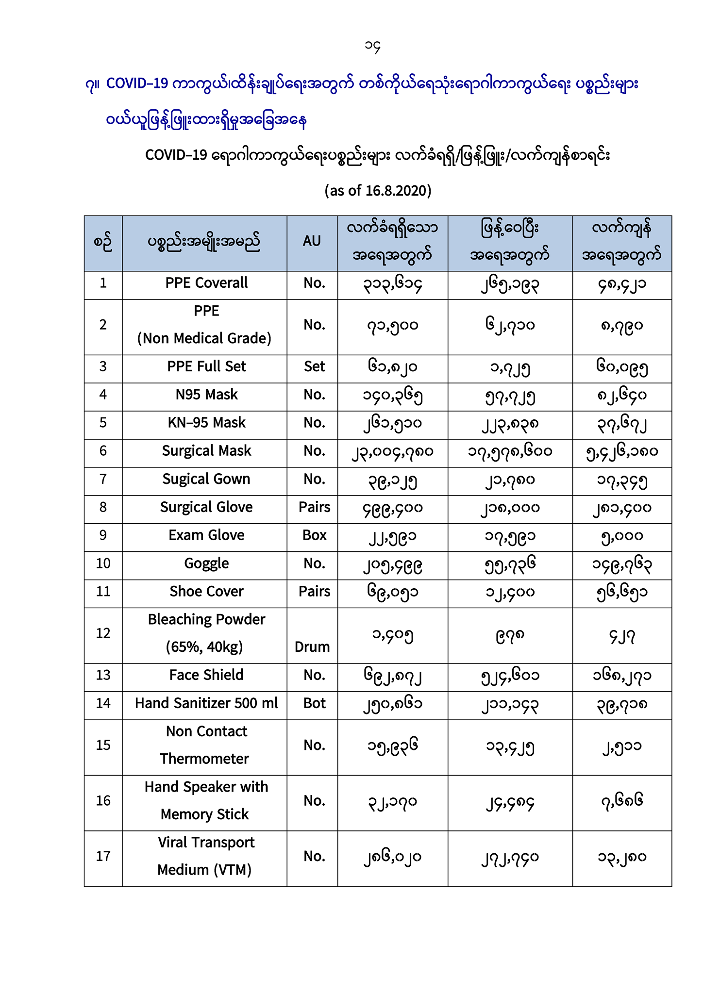 ၇။ COVID-19 ရောဂါကာကွယ်၊ ထိန်းချုပ်ရေးအတွက် တစ်ကိုယ်ရေသုံး ရောဂါကာကွယ်ရေး ပစ္စည်းများ ဝယ်ယူဖြန့်ဖြူးထားရှိမှု အခြေအနေ
