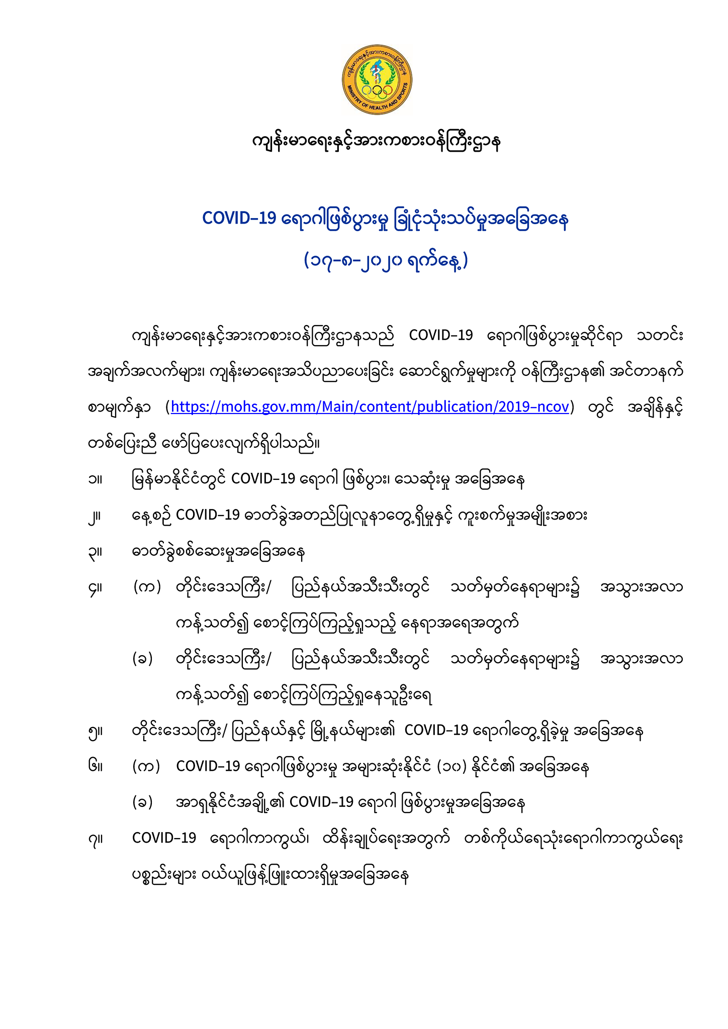 ကျန်းမာရေးနှင့် အားကစားဝန်ကြီးဌာနသည် COVID-19 ရောဂါဖြစ်ပွားမှုဆိုင်ရာ သတင်း အချက်အလက်များ၊ ကျန်းမာရေး အသိပညာပေးခြင်း ဆောင်ရွက်မှုများကို ဝန်ကြီးဌာန၏ အင်တာနက် စာမျက်နှာ (https://mohs.gov.mm/Main/content/publication/2019-ncov) တွင် အချိန်နှင့် တစ်ပြေးညီ ဖော်ပြပေးလျက်ရှိပါသည်။