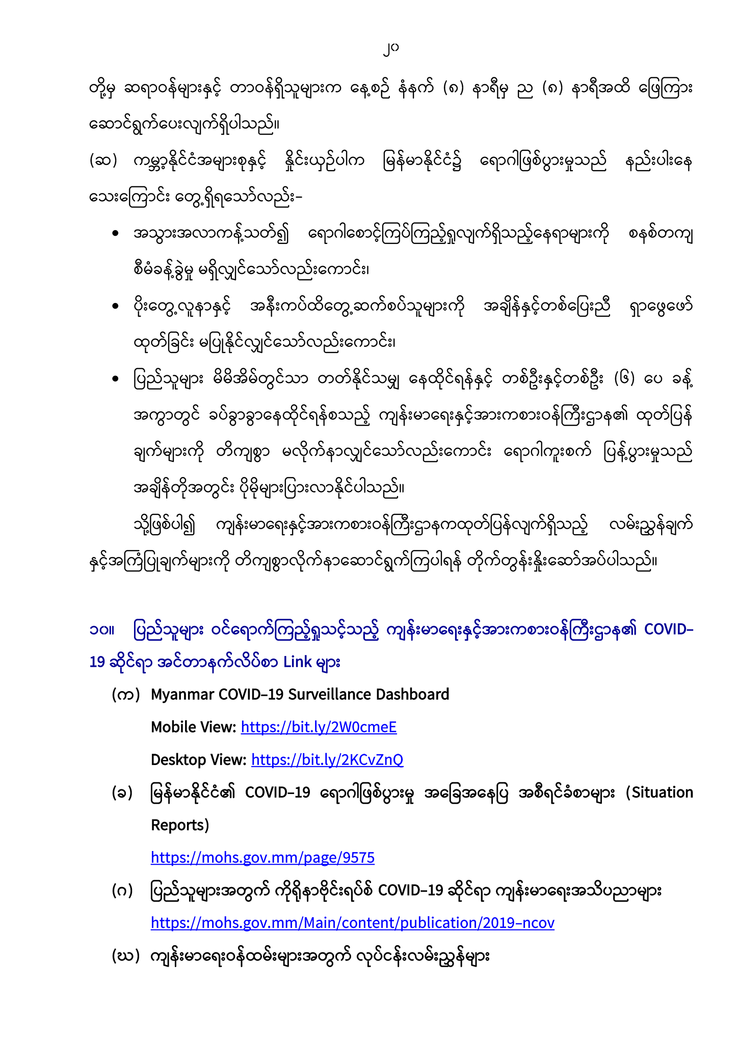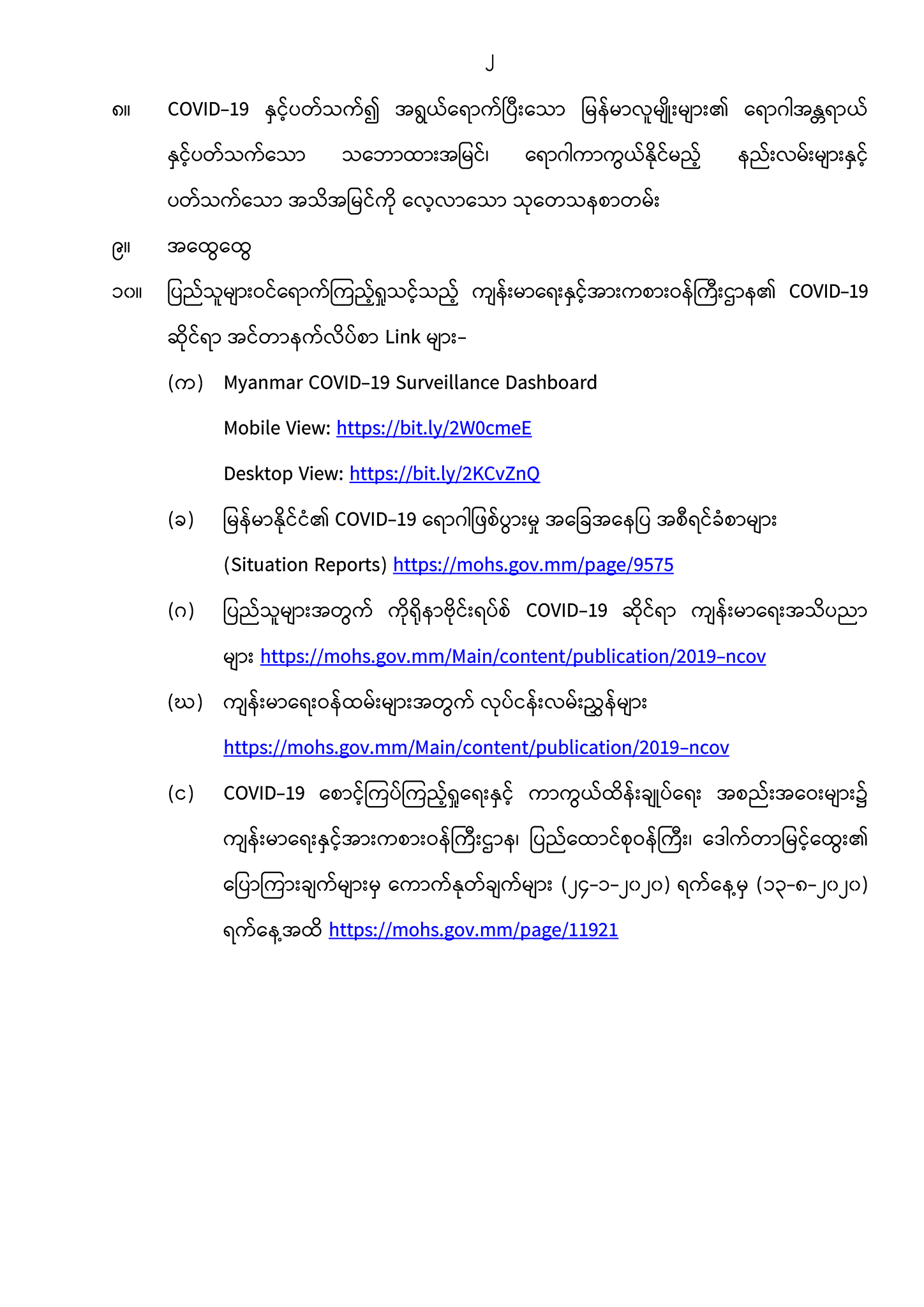 ၁၀။ ပြည်သူများဝင်ရောက်ကြည့်ရှုသင့်သည့် ကျန်းမာရေးနှင့် အားကစားဝန်ကြီးဌာန၏ COVID-19 ဆိုင်ရာ အင်တာနက်လိပ်စာ Link များ-