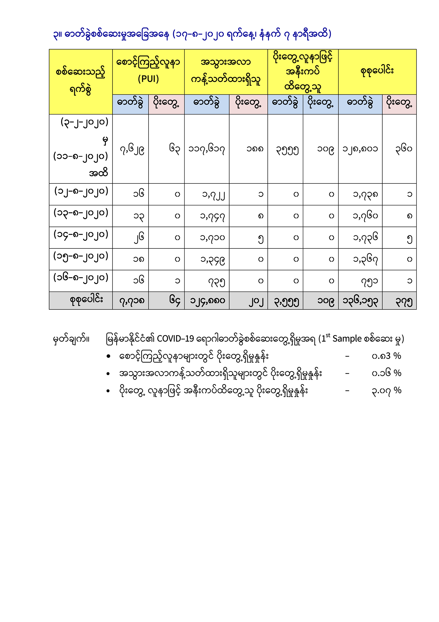 ၂။ နေ့စဉ် COVID-19 ဓာတ်ခွဲအတည်ပြုလူနာတွေ့ရှိမှုနှင့် ကူးစက်မှုအမျိုးအစား