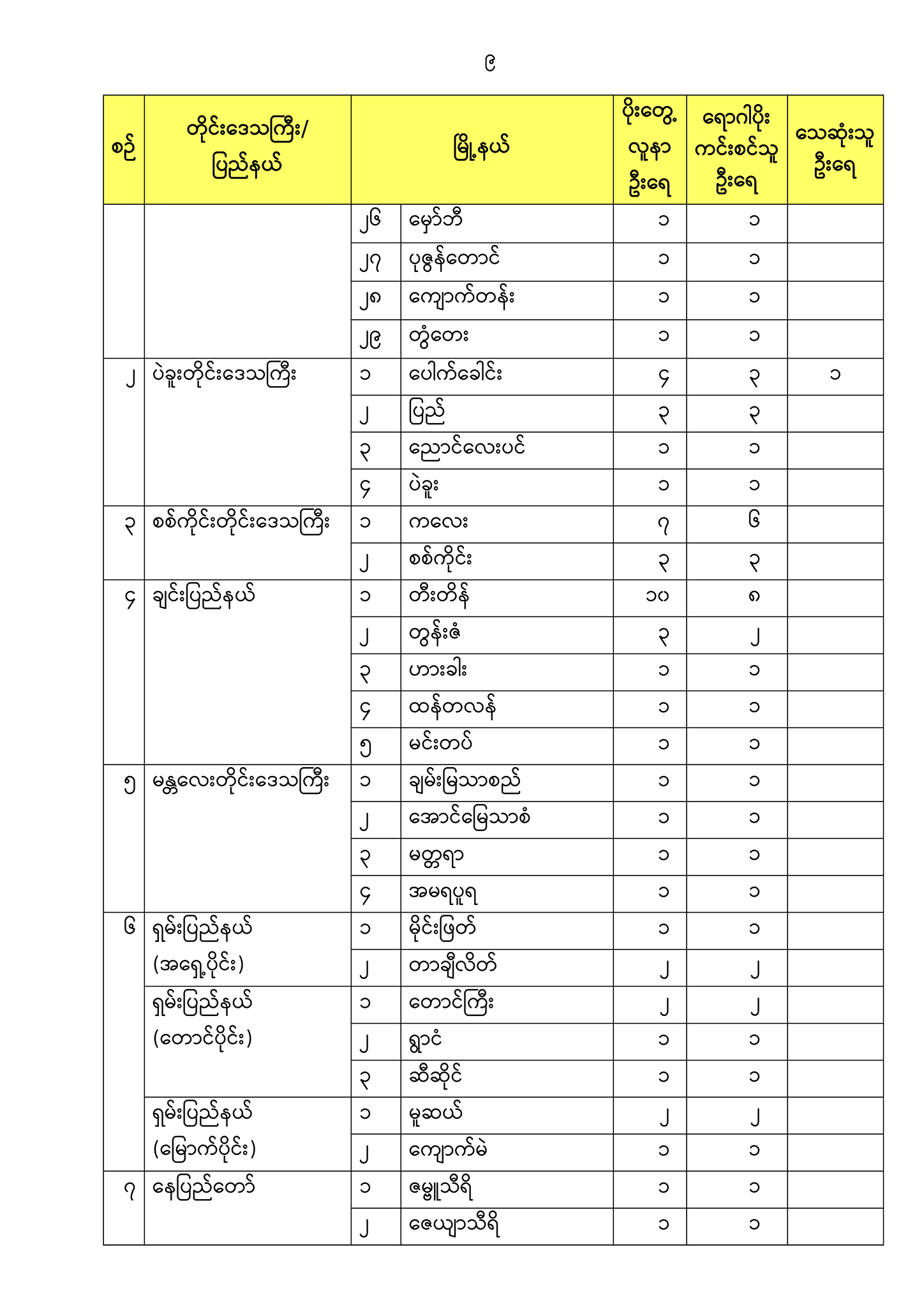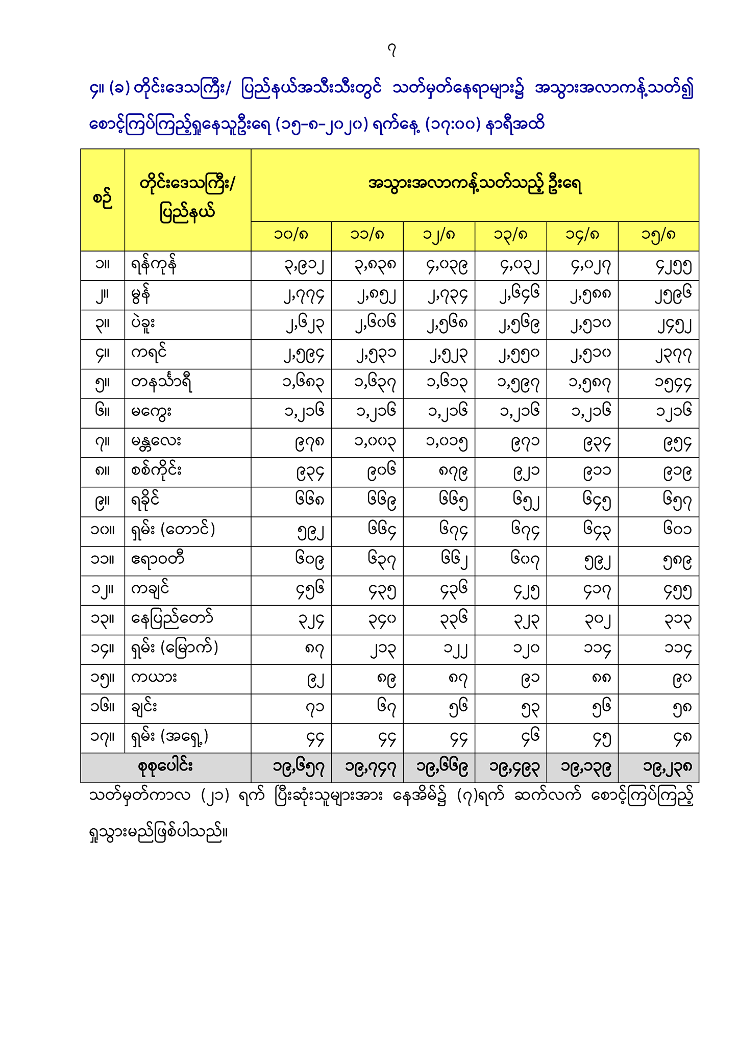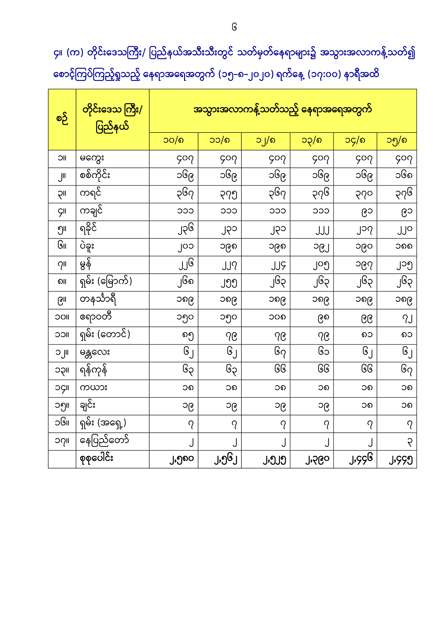၄။ (က) တိုင်းဒေသကြီး/ ပြည်နယ်အသီးသီးတွင် သတ်မှတ်နေရာများ၌ အသွားအလာ ကန့်သတ်၍ စောင့်ကြပ်ကြည့်ရှုသည့် နေရာအရေအတွက်