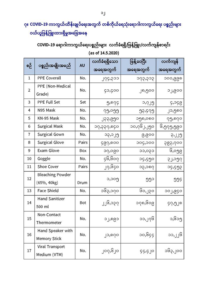 ၇။ COVID-19 ကာကွယ်၊ ထိန်းချုပ်ရေးအတွက် တစ်ကိုယ်ရေသုံး ရောဂါကာကွယ်ရေးပစ္စည်းများ ဝယ်ယူဖြန့်ဖြူးထားရှိမှု အခြေအနေ