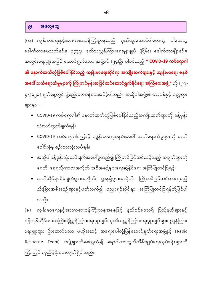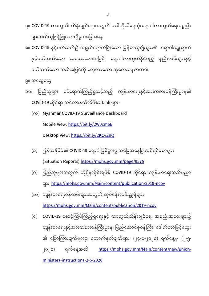 (င) COVID-19 စောင့်ကြပ်ကြည့်ရှုရေးနှင့် ကာကွယ်ထိန်းချုပ်ရေး အစည်းအဝေးများ၌ ကျန်းမာရေးနှင့်အားကစားဝန်ကြီးဌာန၊ ပြည်ထောင်စုဝန်ကြီး၊ ဒေါက်တာမြင့်ထေွး ၏ ပြောကြားချက်များမှ ကောက်နုတ်ချက်များ (၂၄-၁-၂၀၂၀) ရက်နေ့မှ (၂-၅-၂၀၂၀) ရက်နေ့အထိ https://mohs.gov.mm/…/new/union-ministers-instructions-2-5-…