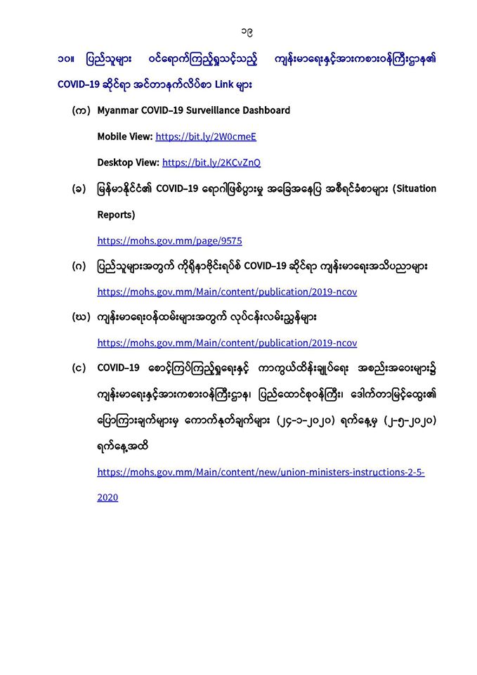 ၁၀။ ပြည်သူများ ဝင်ရောက်ကြည့်ရှုသင့်သည့် ကျန်းမာရေးနှင့်အားကစားဝန်ကြီးဌာန၏ COVID-19 ဆိုင်ရာ အင်တာနက်လိပ်စာ Link များ-