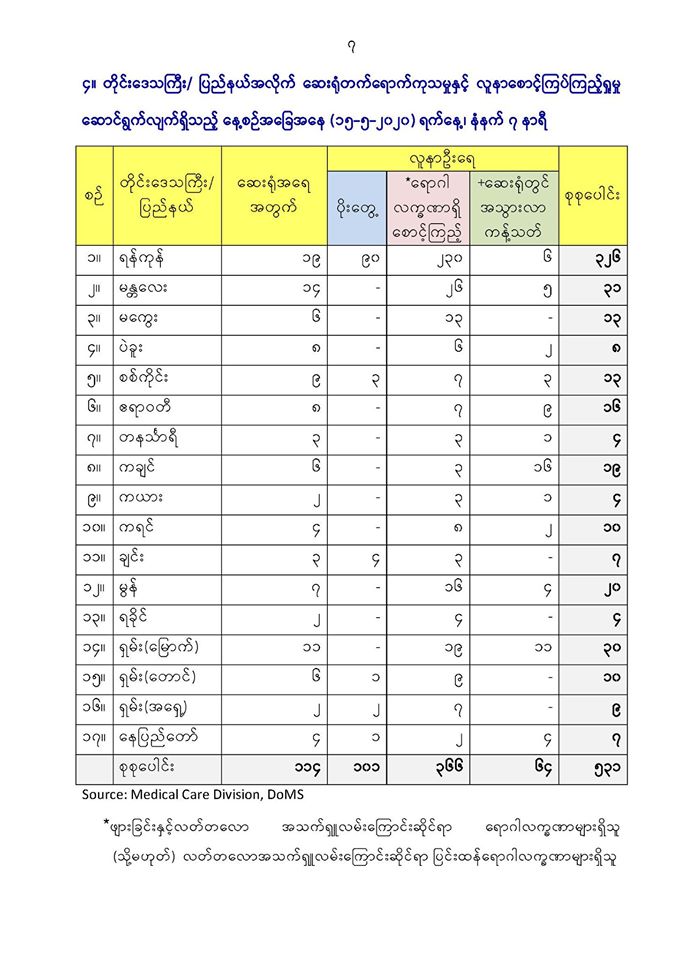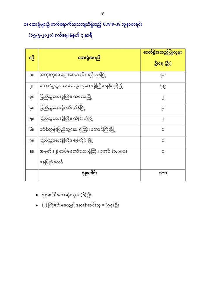 ၁။ ဆေးရုံများ၌ တက်ရောက်ကုသလျက်ရှိသည့် COVID-19 လူနာစာရင်း