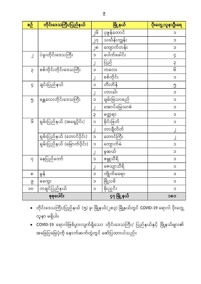 ၅။ COVID-19 ရောဂါဖြစ်ပွားလျက်ရှိသော တိုင်းဒေသကြီး/ ပြည်နယ်နှင့် မြို့နယ်များစာရင်း