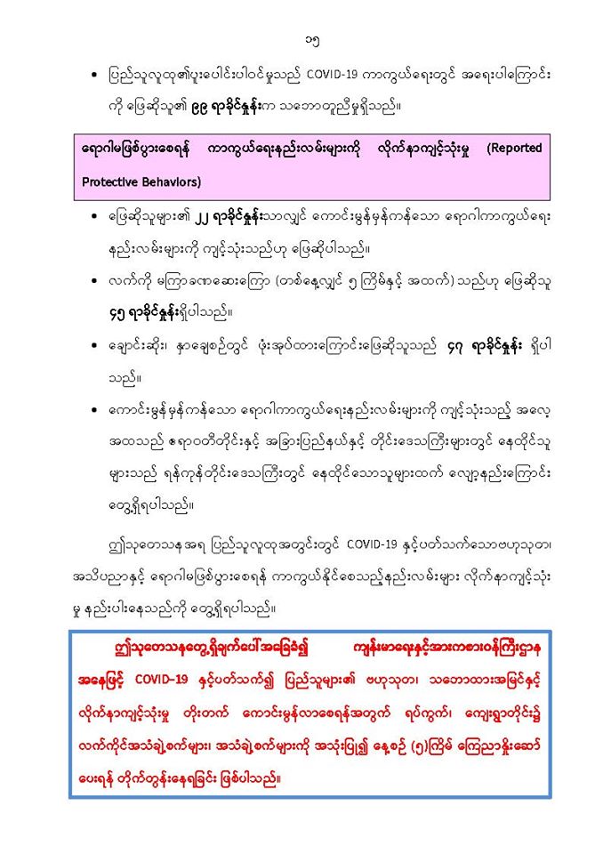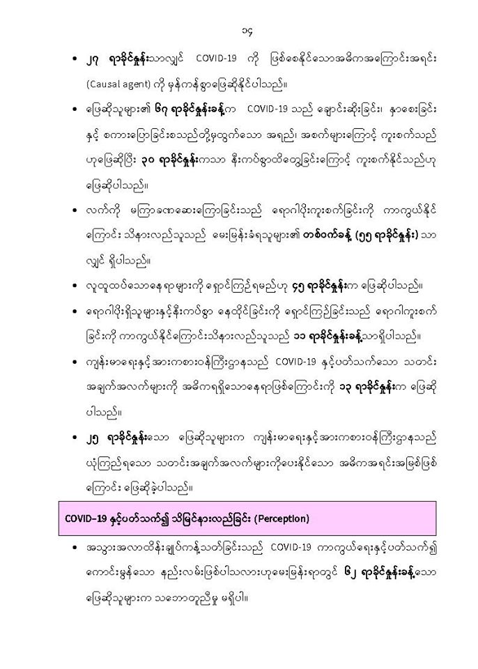 ၈။ COVID-19 နှင့်ပတ်သက်၍ အရွယ်ရောက်ပြီးသော မြန်မာလူမျိုးများ၏ ရောဂါအန္တရာယ် နှင့်ပတ်သက်သော သဘောထားအမြင်၊ ရောဂါကာကွယ်နိုင်မည့် နည်းလမ်းများနှင့် ပတ်သက်သော အသိအမြင်ကို လေ့လာသော သုတေသနစာတမ်း