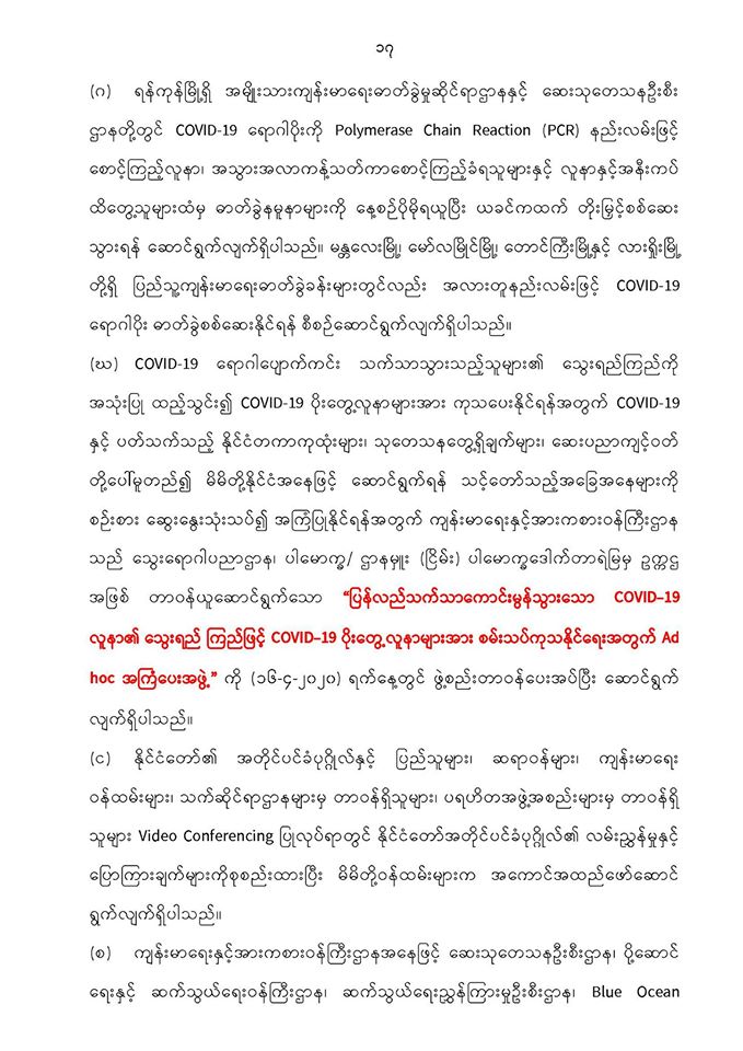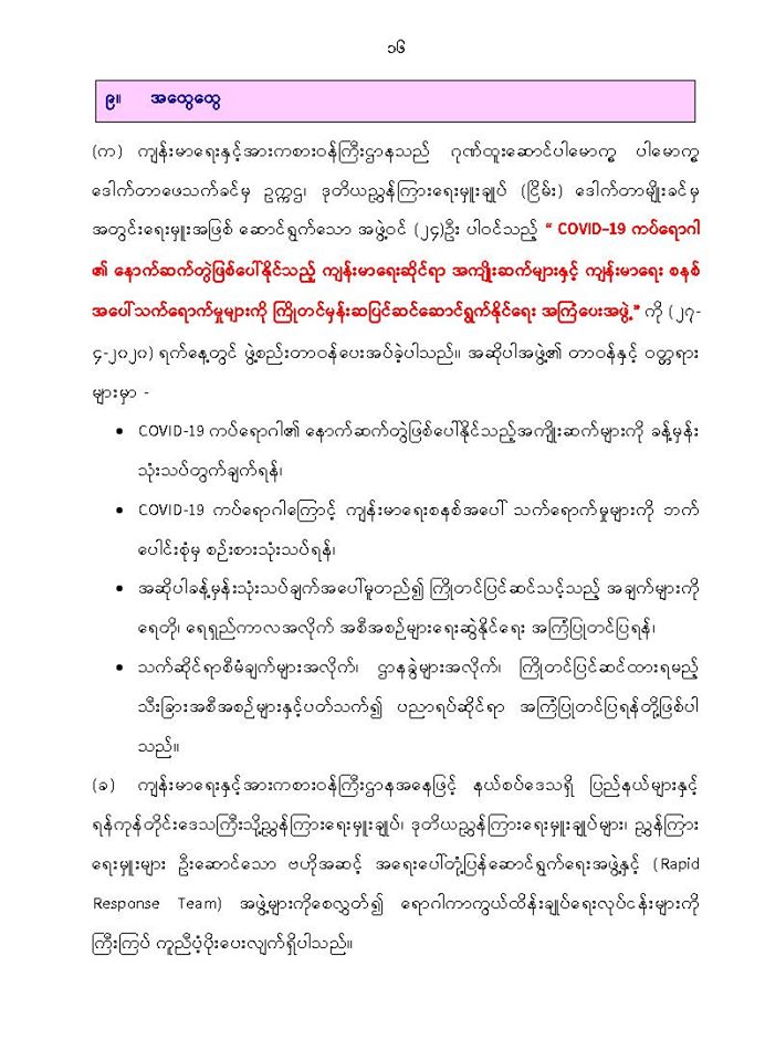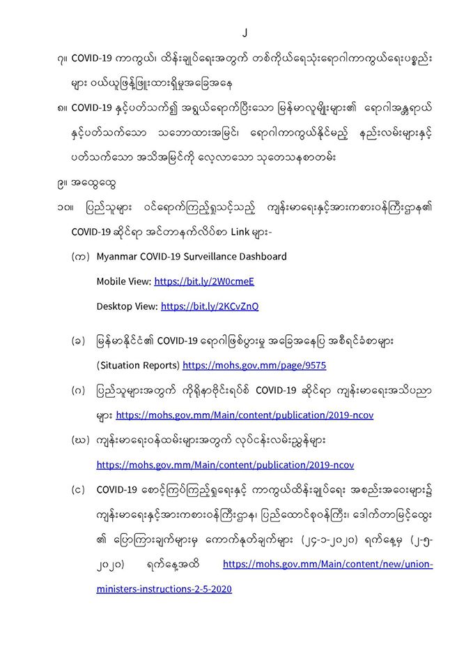(င) COVID-19 စောင့်ကြပ်ကြည့်ရှုရေးနှင့် ကာကွယ်ထိန်းချုပ်ရေး အစည်းအဝေးများ၌ ကျန်းမာရေးနှင့် အားကစားဝန်ကြီးဌာန၊ ပြည်ထောင်စုဝန်ကြီး၊ ဒေါက်တာမြင့်ထေွး၏ ပြောကြားချက်များမှ ကောက်နုတ်ချက်များ (၂၄-၁-၂၀၂၀) ရက်နေ့မှ (၂-၅-၂၀၂၀) ရက်နေ့အထိ https://mohs.gov.mm/…/new/union-ministers-instructions-2-5-…