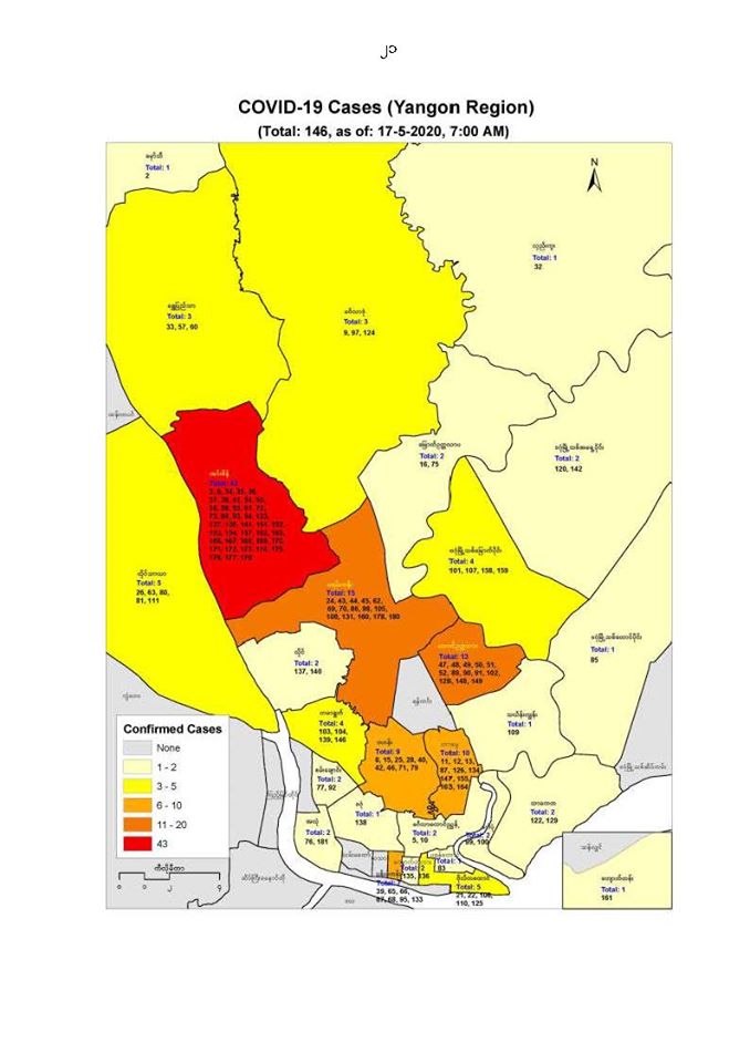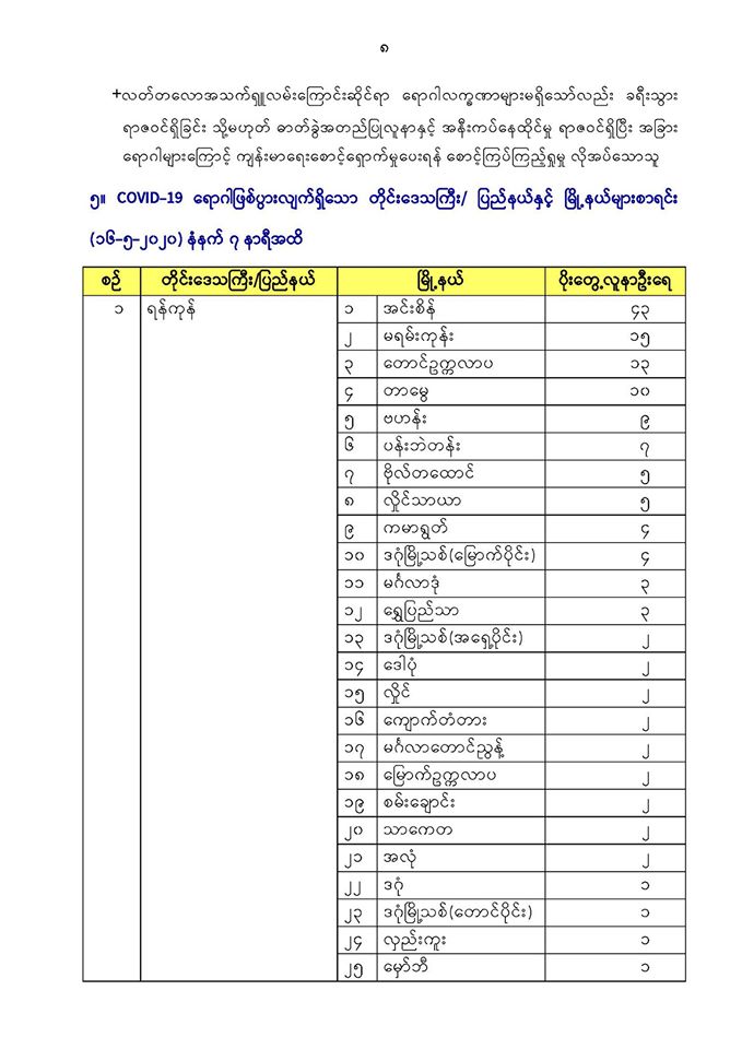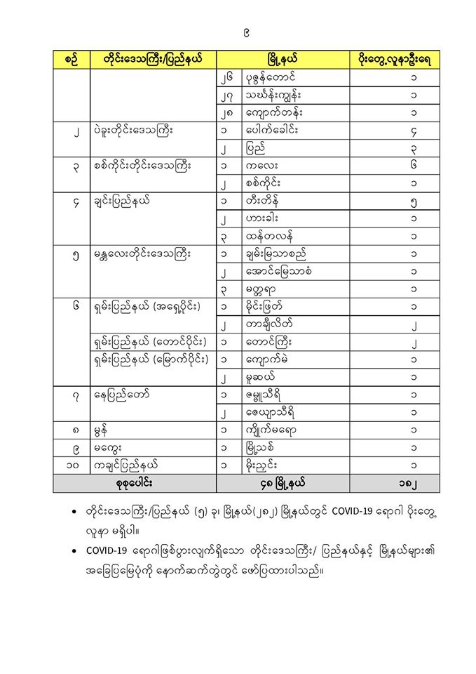 ၅။ COVID-19 ရောဂါဖြစ်ပွားလျက်ရှိသော တိုင်းဒေသကြီး/ ပြည်နယ်နှင့် မြို့နယ်များစာရင်း