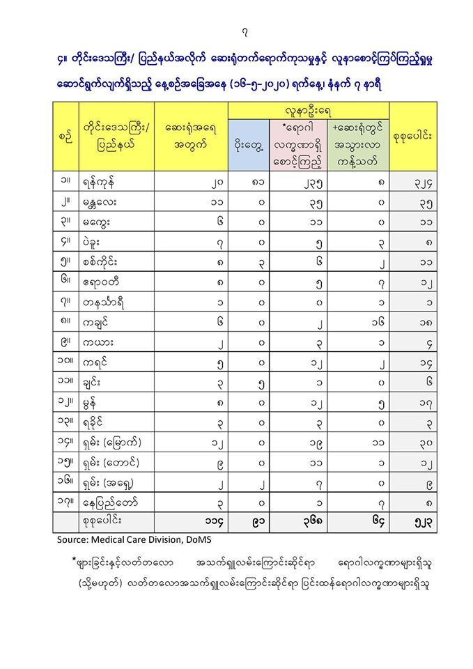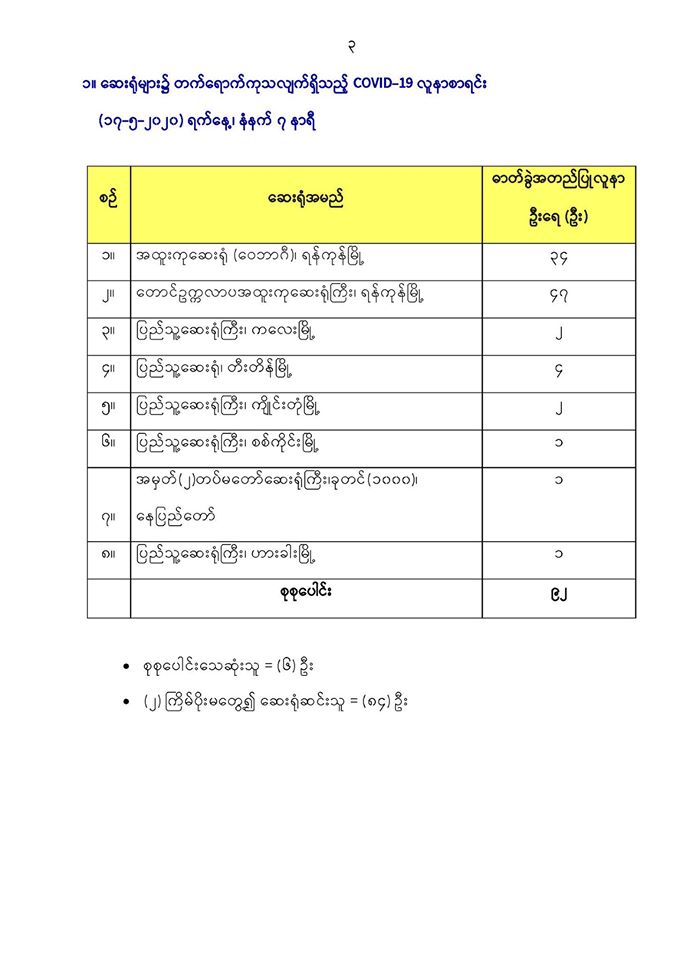 ၁။ ဆေးရုံများ၌ တက်ရောက်ကုသလျက်ရှိသည့် COVID-19 လူနာစာရင်း