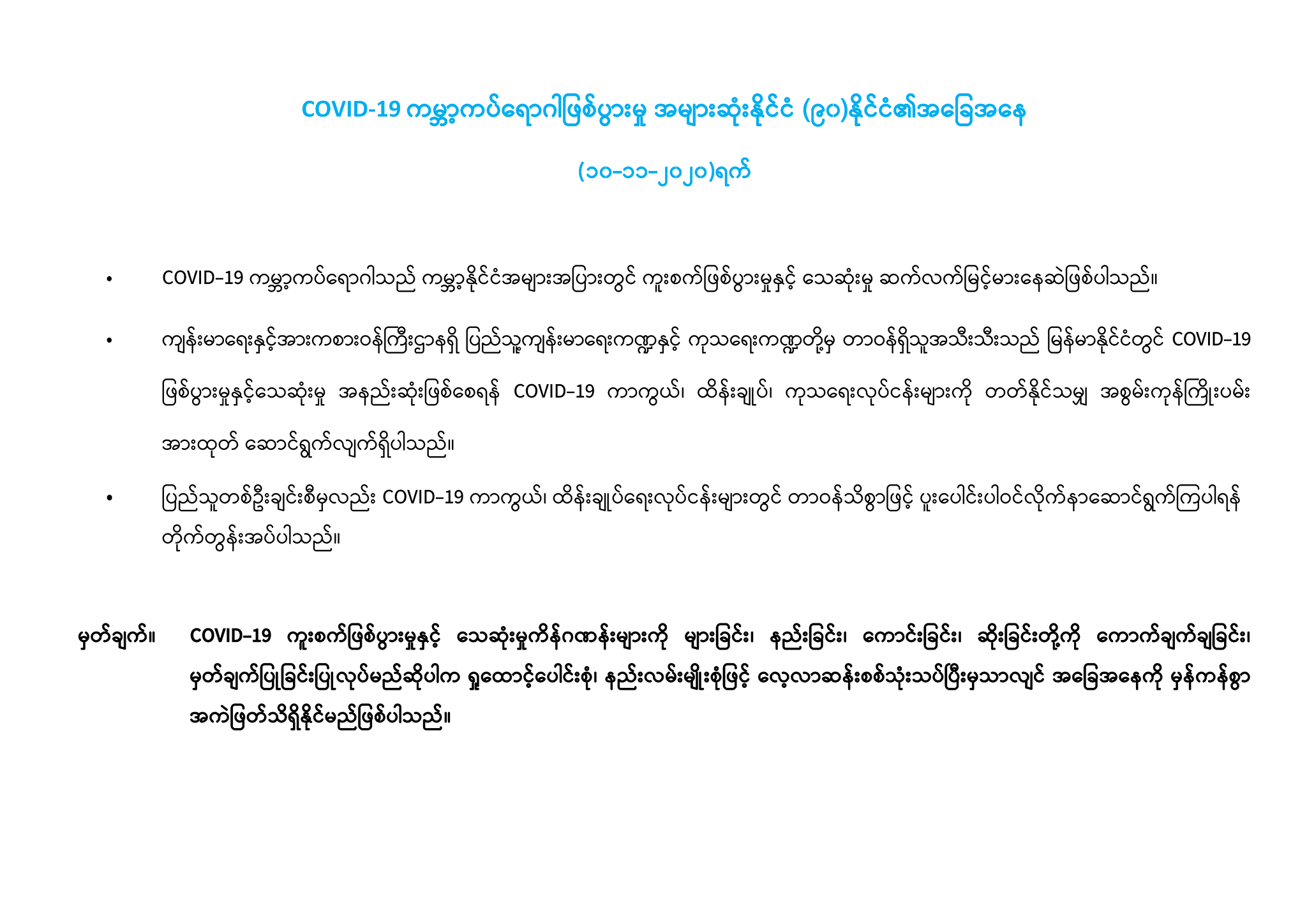 Nov 10,2020 |04:25 | (WHO ၏ (၉-၁၁-၂၀၂၀) ရက်နေ့၊ မြန်မာစံတော်ချိန် (၁၉:၃၀) အချိန်အထိ ထုတ်ပြန်ချက်) Crd. Ministry of Health and Sports, Myanmar