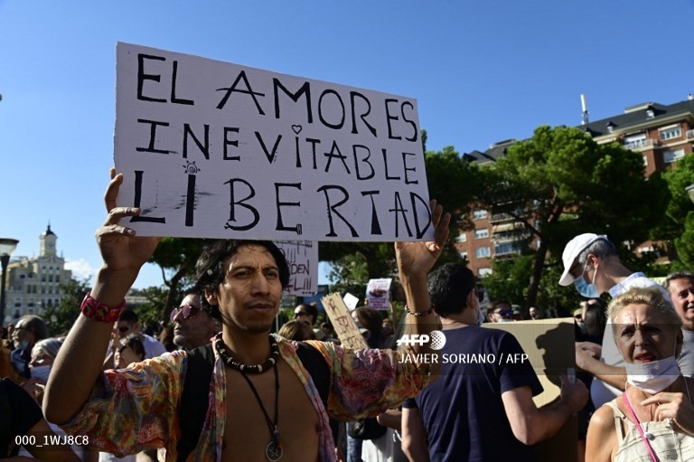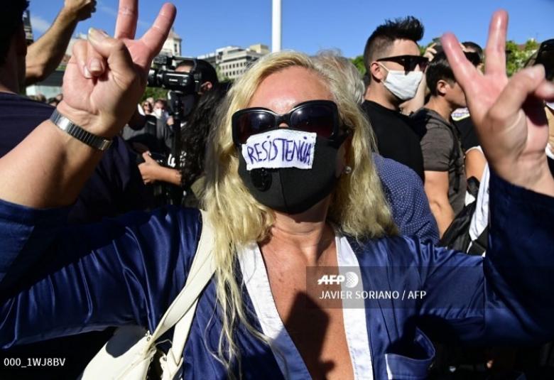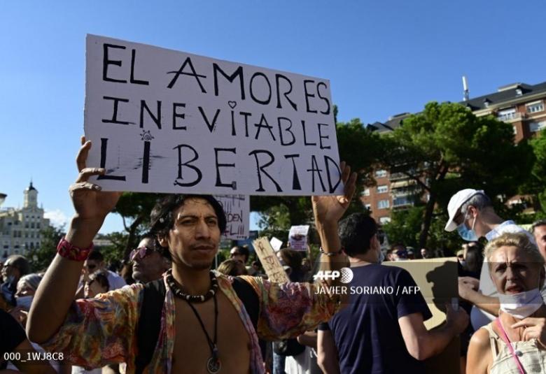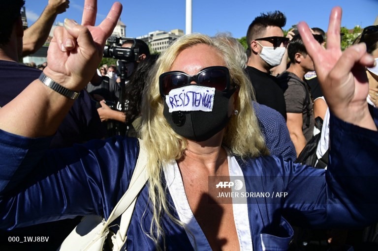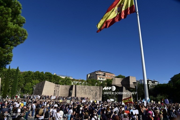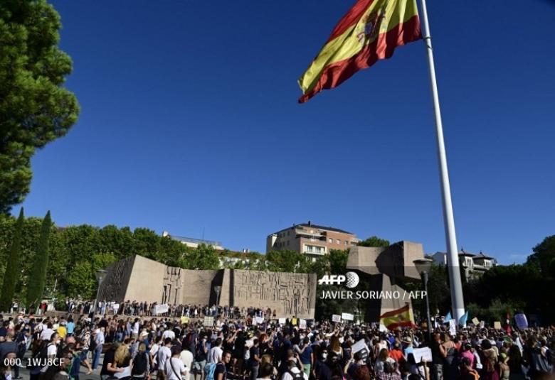 စပိန်နိုင်ငံမှာ ကိုရိုနာဗိုင်းရပ်စ်ရောဂါပိုး ပြန့်ပွားမှုကို ထိန်းချုပ်ရန်အတွက် မျက်နှာဖုံး မဝတ်မနေရ စည်းမျဉ်းအပါအဝင် အခြားစည်းမျဉ်းတွေကို ဆန့်ကျင်တဲ့အနေနဲ့ ရာချီတဲ့ လူတွေစုဝေးပြီး မက်ဒရစ်မြို့မှာ တနင်္ဂနွေနေ့က ဆန္ဒပြခဲ့ကြပါတယ်။