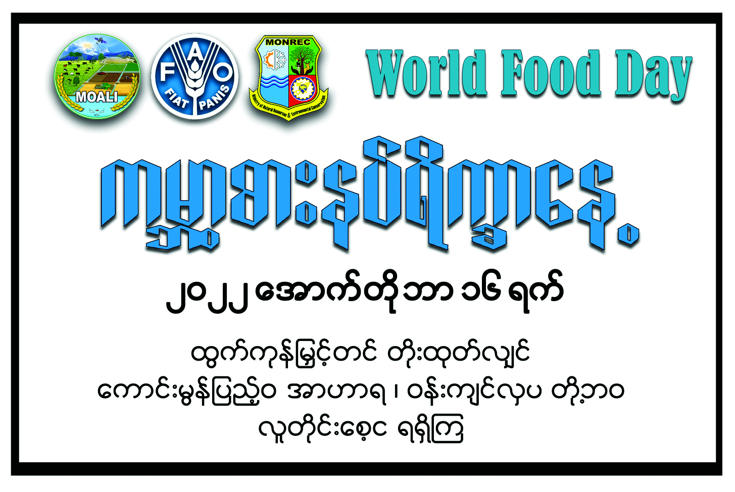 လူသားတစ်ယောက်၏ လိုအပ်ချက်များတွင် စား၊ ဝတ်၊ နေရေးမှာ အခြေခံလိုအပ်ချက်သုံးမျိုး ဖြစ်ပါသည်။ ယင်းအခြေခံလိုအပ်ချက်သုံးမျိုးတွင် စားသောက်ရေးမှာ မရှိမဖြစ်အရေးကြီးဆုံးဖြစ်သည်။ ယနေ့ကမ္ဘာကြီးတွင် လူသားတို့အတွက် စားနပ်ရိက္ခာဖူလုံရေးမှာ စိန်ခေါ်မှုတစ်ခုဖြစ်လာနေပြီး ထိထိရောက်ရောက်ဖြေရှင်းရမည့် ကိစ္စတစ်ခု ဖြစ်နေပါသည်။ သို့ဖြစ်ရာ စားနပ်ရိက္ခာဖူလုံရေးနှင့် ပတ်သက်၍ ကမ္ဘာတစ်ဝန်း နိုးကြားလာစေရန်အတွက် ကမ္ဘာ့စားနပ်ရိက္ခာနှင့် စိုက်ပျိုးရေးအဖွဲ့ (FAO) က နှစ်စဉ် အောက်တိုဘာ ၁၆ ရက်ကို ကမ္ဘာ့စားနပ်ရိက္ခာနေ့အဖြစ်သတ်မှတ်၍ ကမ္ဘာ့နိုင်ငံများတွင် နှစ်စဉ် ကျင်းပလျက်ရှိသည်။