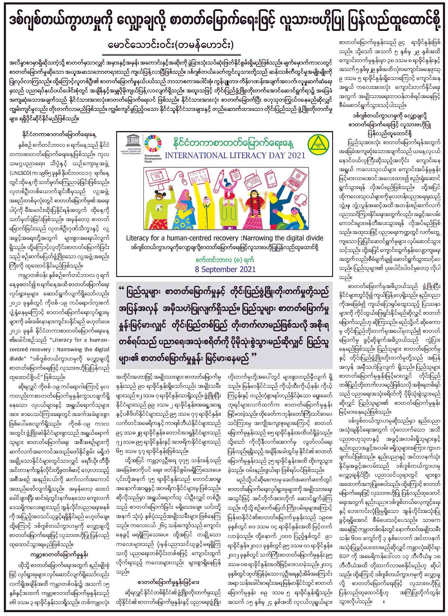ဒစ်ဂျစ်တယ်ကွာဟမှုကို လျှော့ချလို့ စာတတ်မြောက်ရေးဖြင့် လူသားဗဟိုပြု ပြန်လည်ထူးထောင်ရန်