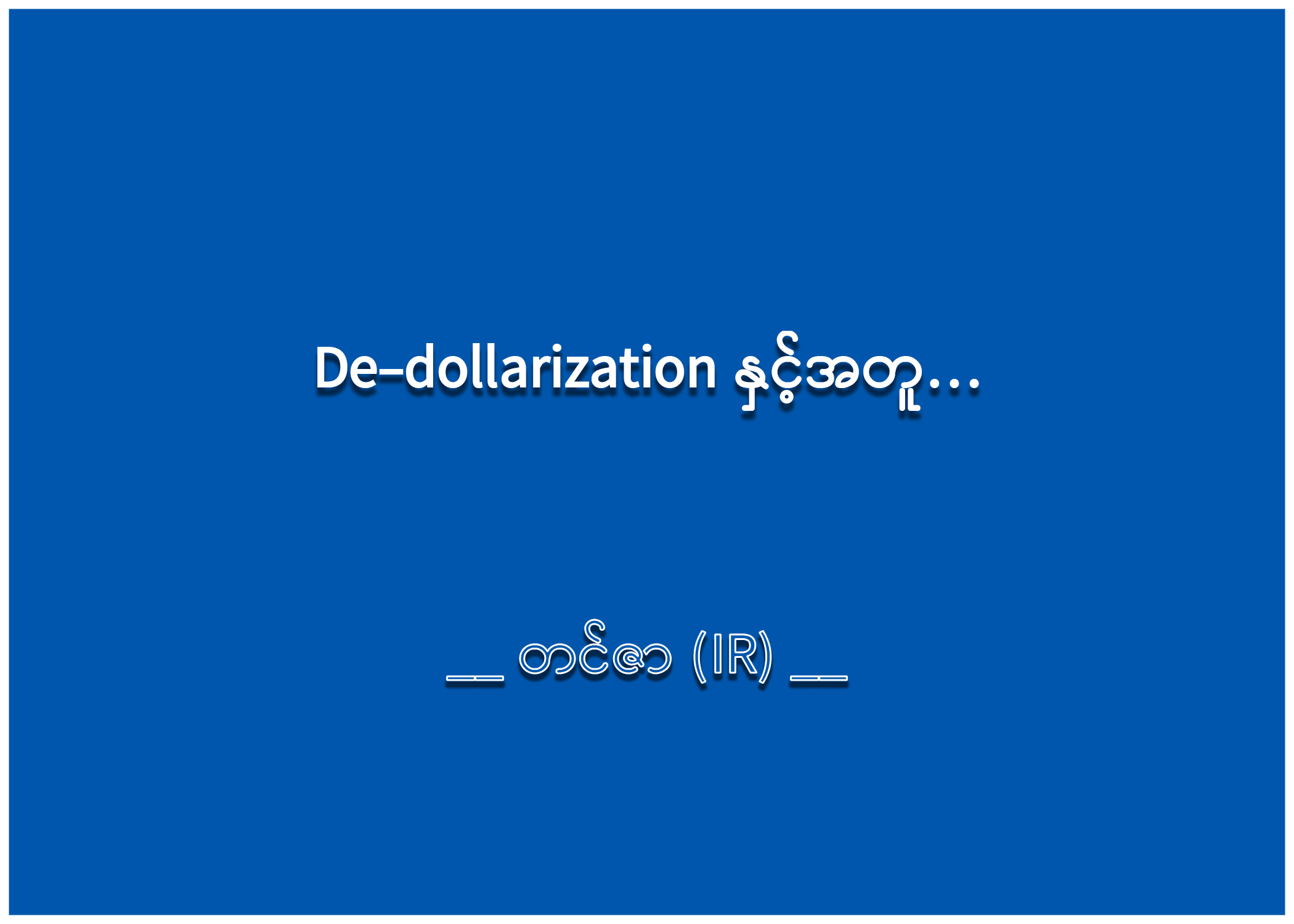 မိမိနိုင်ငံအနေဖြင့်လည်း ရွှေစုချိန်တန်ပြီဖြစ်ကြောင်း ပညာရှင်များ၏ အကြံပြုချက်များကို မကြာခဏ ကြားသိနေရပါသည်။ မူဝါဒရေးဆွဲချမှတ် သူများအနေဖြင့် De-dollarization ဖြစ်စဉ် စဉ်ဆက်မပြတ် အောင်မြင်သွားရန်နှင့် ပြည်တွင်း သုံးငွေကြေးများ ဒေါ်လာကဲ့သို့တွင်တွင်ကျယ်ကျယ် အသုံးပြုလာနိုင်ရေး ဆက်လက် ကြိုးပမ်းသွားကြ ရမည် ဖြစ်ပါသည်။ De-dollarization ၏ အနာဂတ်သည် မသေချာ မရေရာသေးသော်လည်း ယင်းအတွက် ကြိုးပမ်းမှုများကိုမူ ရှောင်လွှဲ၍ ရနိုင်မည်မဟုတ်ပါသောကြောင့် နိုင်ငံများအနေဖြင့် ကြိုတင်ပြင်ဆင်မှုများ ဆောင်ရွက်ထားရန် လိုအပ် ပါကြောင်း ရေးသားတင်ပြလိုက်ရပါသည်။