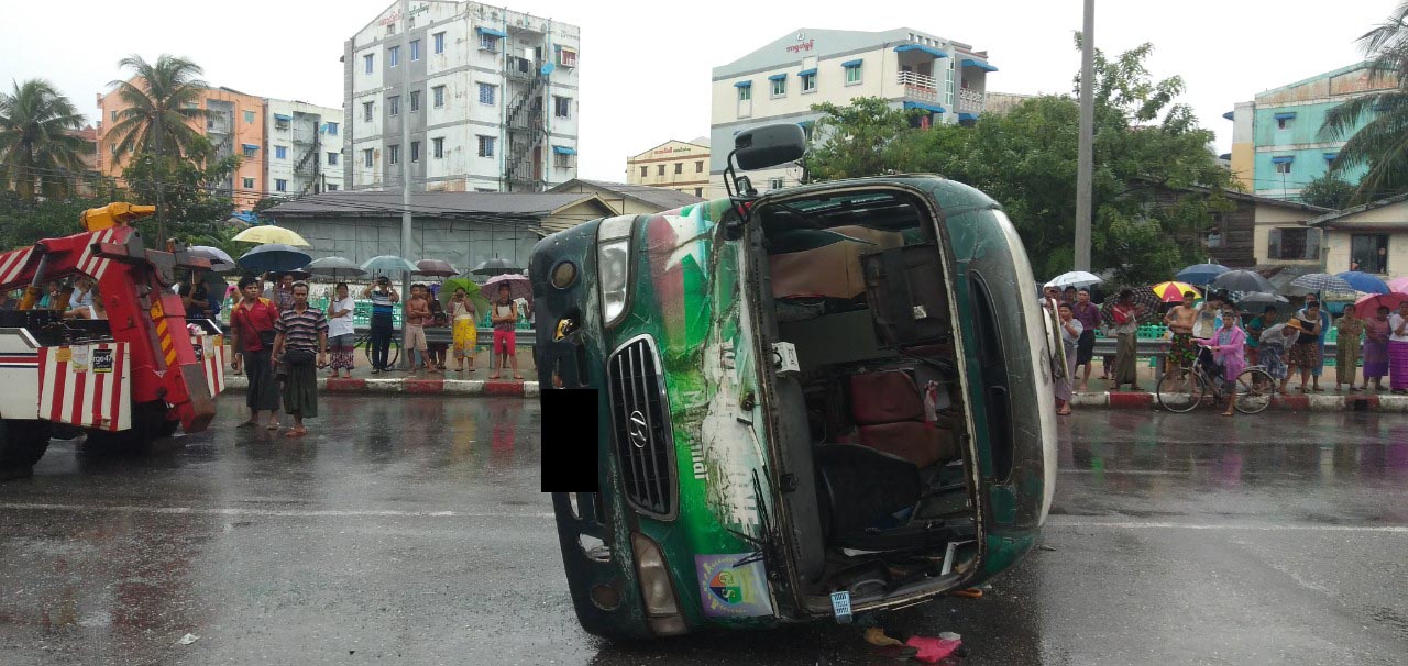 ရန်ကုန်တိုင်းဒေသကြီး ဒေါပုံမြို့နယ် ဝါဆိုရပ်ကွက် ဒေါပုံတံတား (ဂျပန်တံတား)အဆင်း လမ်းလယ်တွင် ယနေ့ ညနေ ၄ နာရီခန့်က မင်္ဂလာတောင်ညွန့် (မင်္ဂလာဈေး) ဘက်မှ ကျောက်တန်းမြို့နယ်ဘက်သို့ ပြေးဆွဲသည့် YBS 33 ဖြူ/စိမ်းရောင် မီနီဘတ်စ်ယာဉ်တိမ်းမှောက်ခဲ့ကြောင်း သိရသည်။