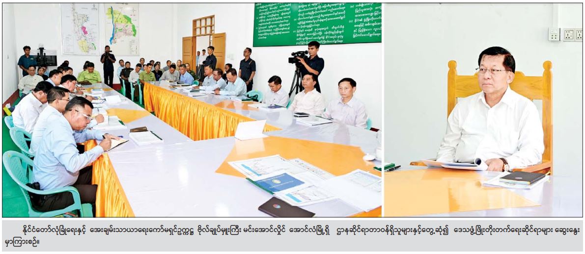 နိုင်ငံတော်လုံခြုံရေးနှင့် အေးချမ်းသာယာရေးကော်မရှင်ဥက္ကဋ္ဌ ဗိုလ်ချုပ်မှူးကြီးမင်းအောင်လှိုင်သည် ယနေ့နံနက်ပိုင်းတွင် ကော်မရှင်အတွင်းရေးမှူး၊ တွဲဖက်အမှုဆောင်ချုပ် ဗိုလ်ချုပ်ကြီးရဲဝင်းဦး၊ ပြည်ထောင်စုဝန်ကြီးများ၊ ကာကွယ်ရေးဦးစီးချုပ်ရုံးမှ အဆင့်မြင့် တပ်မတော်အရာရှိကြီးများ၊ မကွေးတိုင်းဒေသကြီးဝန်ကြီးချုပ်၊ အလယ်ပိုင်းတိုင်းစစ်ဌာနချုပ်တိုင်းမှူးနှင့် တာဝန်ရှိသူများ လိုက်ပါ၍ အောင်လံမြို့ရှိ အောင်လံခရိုင်အထွေထွေအုပ်ချုပ်ရေးမှူးရုံး အစည်းအဝေးခန်းမ၌ ဌာနဆိုင်ရာတာဝန်ရှိသူများနှင့် တွေ့ဆုံပြီး ဒေသဖွံ့ဖြိုး တိုးတက်ရေးလုပ်ငန်းများ ဆွေးနွေးမှာကြားသည်။
