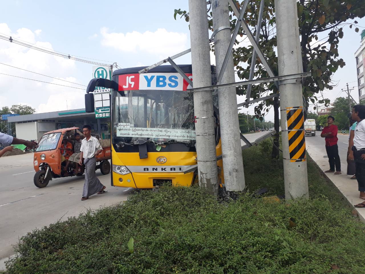 ယာဉ်မောင်းသန့်ဇော်မြင့် မောင်းနှင်လာသော YBS (၂၄)ယာဉ်လိုင်းမှ ယာဉ်သည် ပြည်ထောင်စုလမ်းအတိုင်း တောင်မြောက်လမ်းဆုံဘက်သို့ မောင်းနှင်လာစဉ် အရှိန်မထိန်းနိုင်ဘဲ လမ်းဘေးရှိ ဓါတ်တိုင်အား ဝင်တိုက်မှုဖြစ်ပွားခဲ့ရာ ယာဉ်ပေါ်ပါလာသူ ခရီးသည်များ ထိခိုက်ဒဏ်ရာရရှိမှု မရှိကြောင်းနှင့် မြို့နယ်ယာဉ်ထိန်းတပ်ဖွဲ့စုမှူးရုံးမှ ယာဉ်မောင်းသန့်ဇော်မြင့် အား ဥပဒေအရ အရေးယူဆောင်ရွက်လှျက်ရှိကြောင်း သိရသည်။