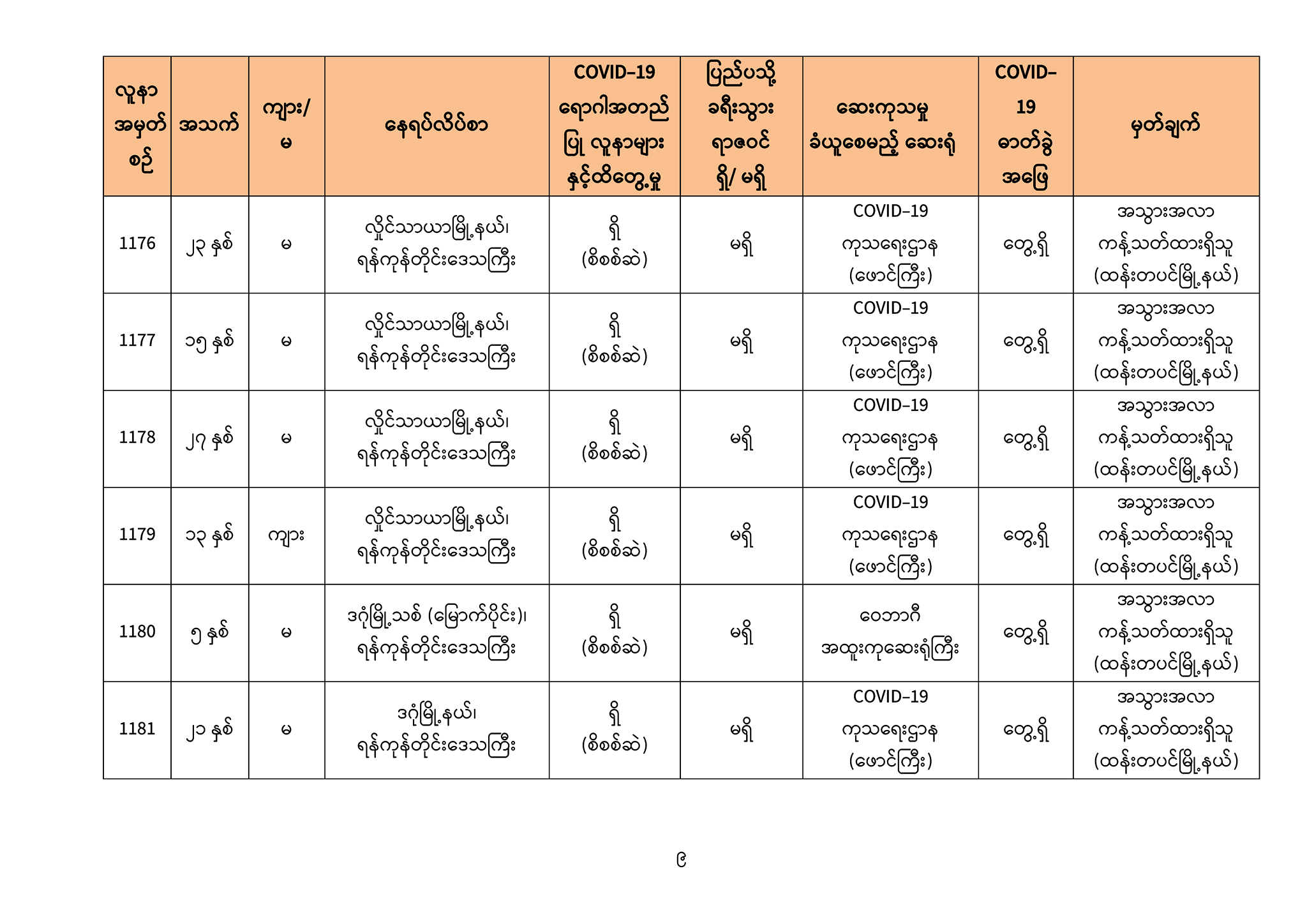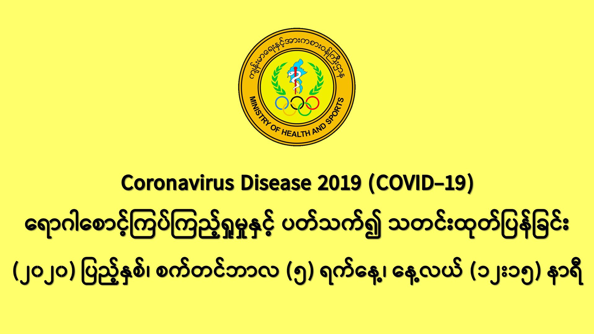 ၁။ (၄-၉-၂၀၂၀) ရက်နေ့အတွက် COVID-19 ရောဂါ ဓာတ်ခွဲစစ်ဆေးမှုများ အနေဖြင့် -ဓာတ်ခွဲနမူနာ စုစုပေါင်း (၃,၁၇၅) ခုအား စစ်ဆေးခဲ့ပြီး COVID-19 ရောဂါဓာတ်ခွဲအတည်ပြုလူနာသစ် (၈၃) ဦးတွေ့ရှိခဲ့ပါသည်။ (အဆိုပါ လူနာများဓာတ်ခွဲတွေ့ရှိမှုသတင်းကို ထုတ်ပြန်ခဲ့ပြီးဖြစ်ပါသည်။)