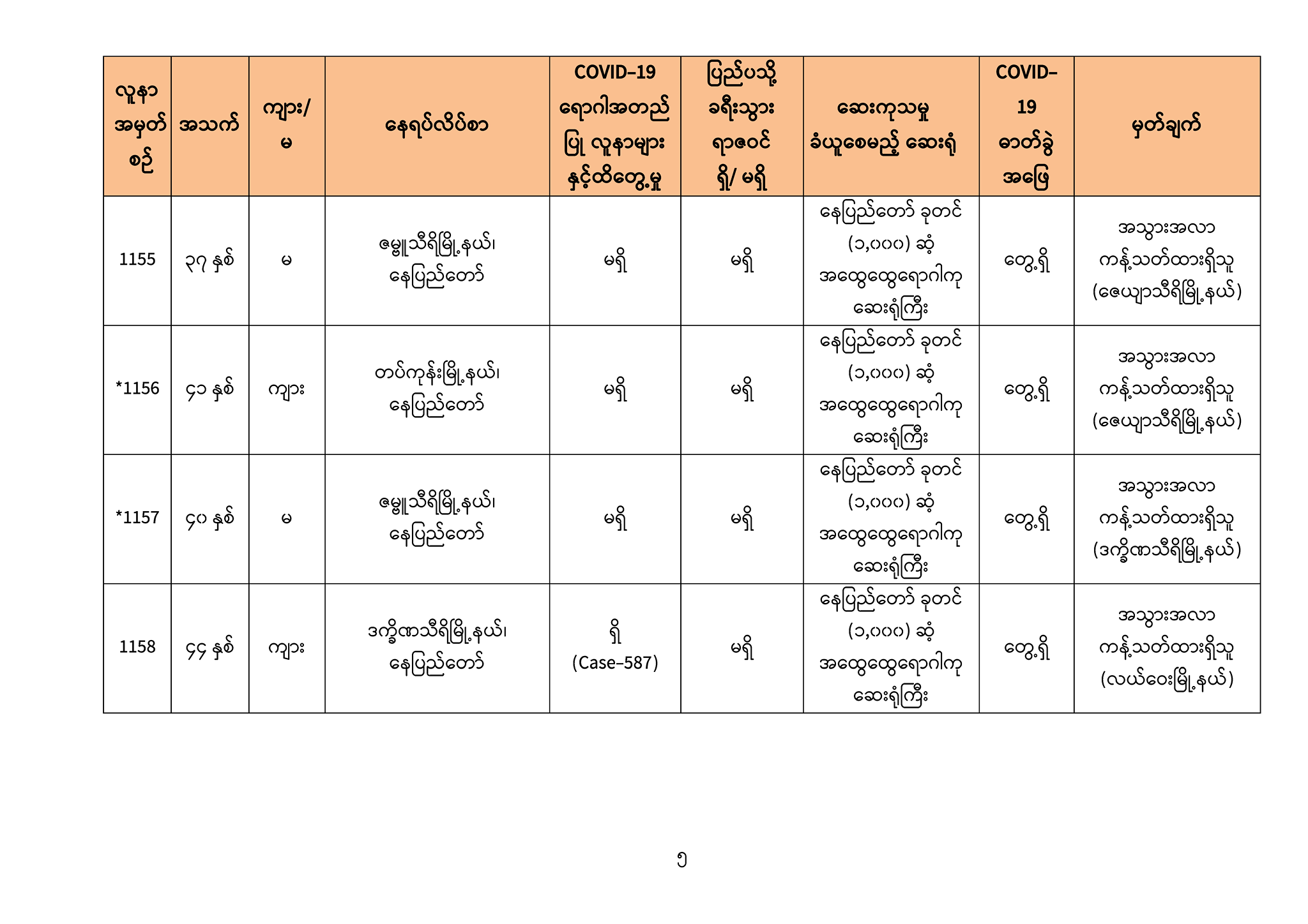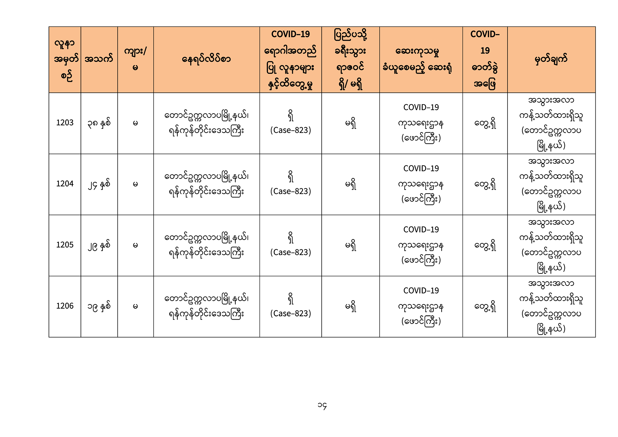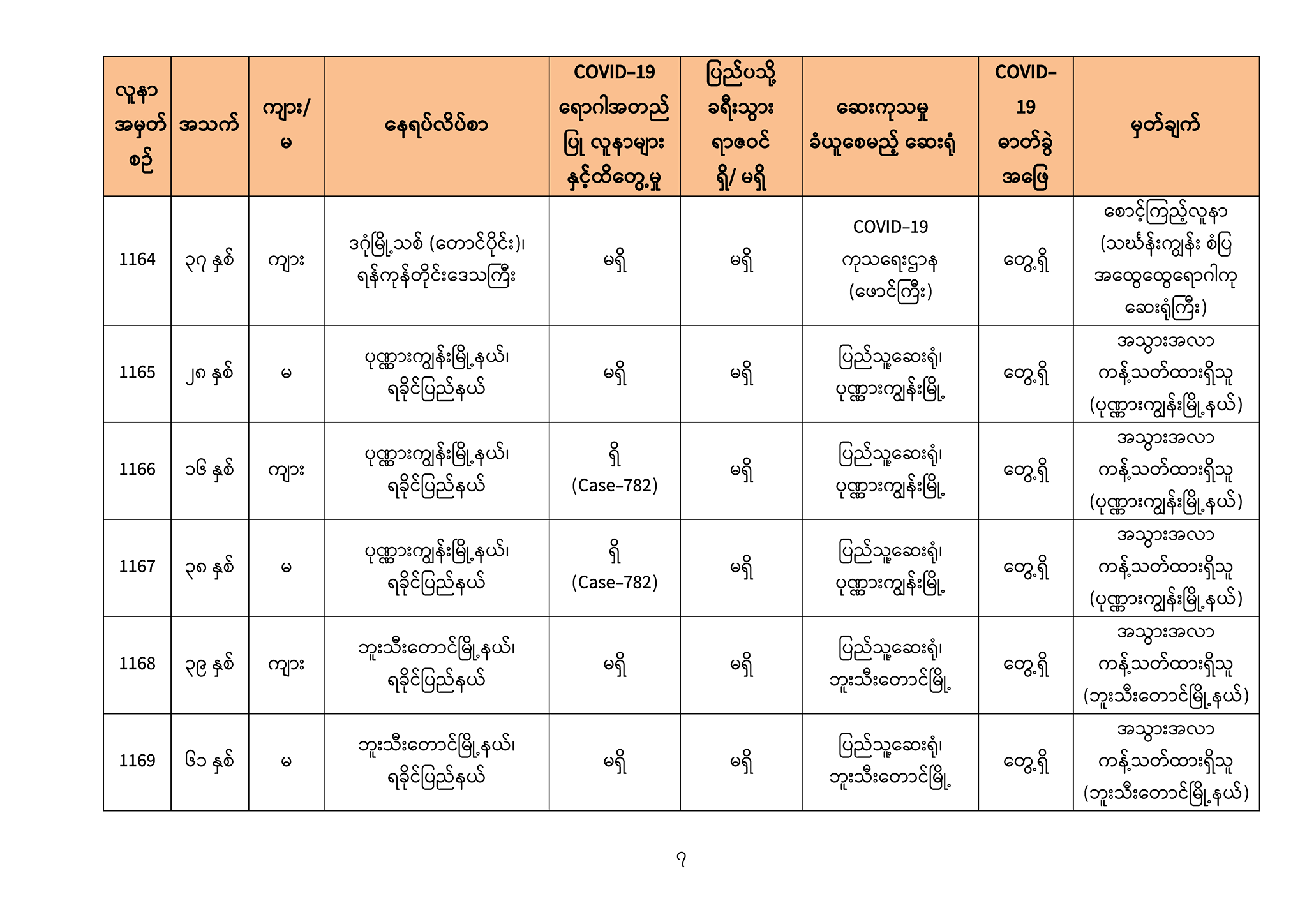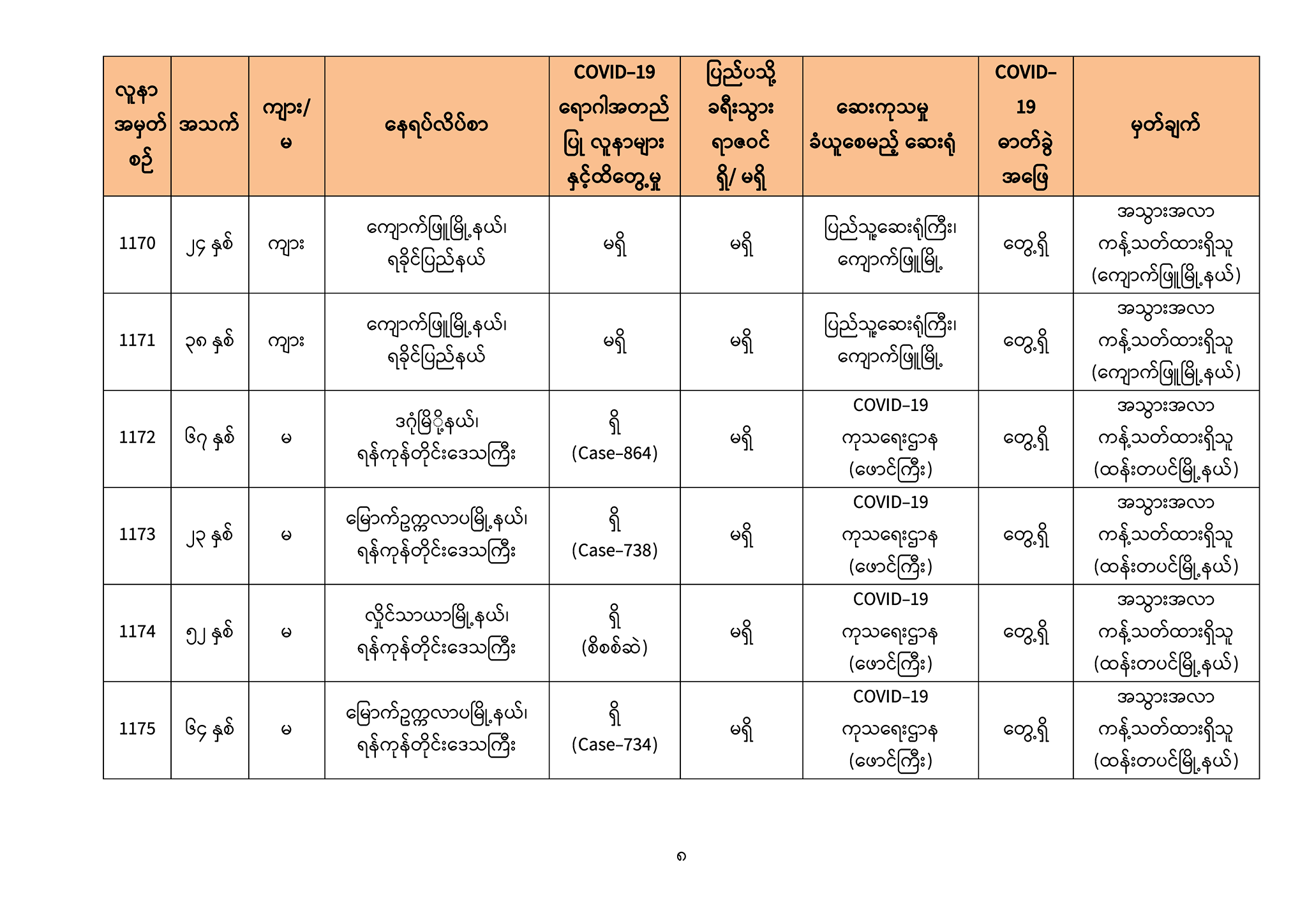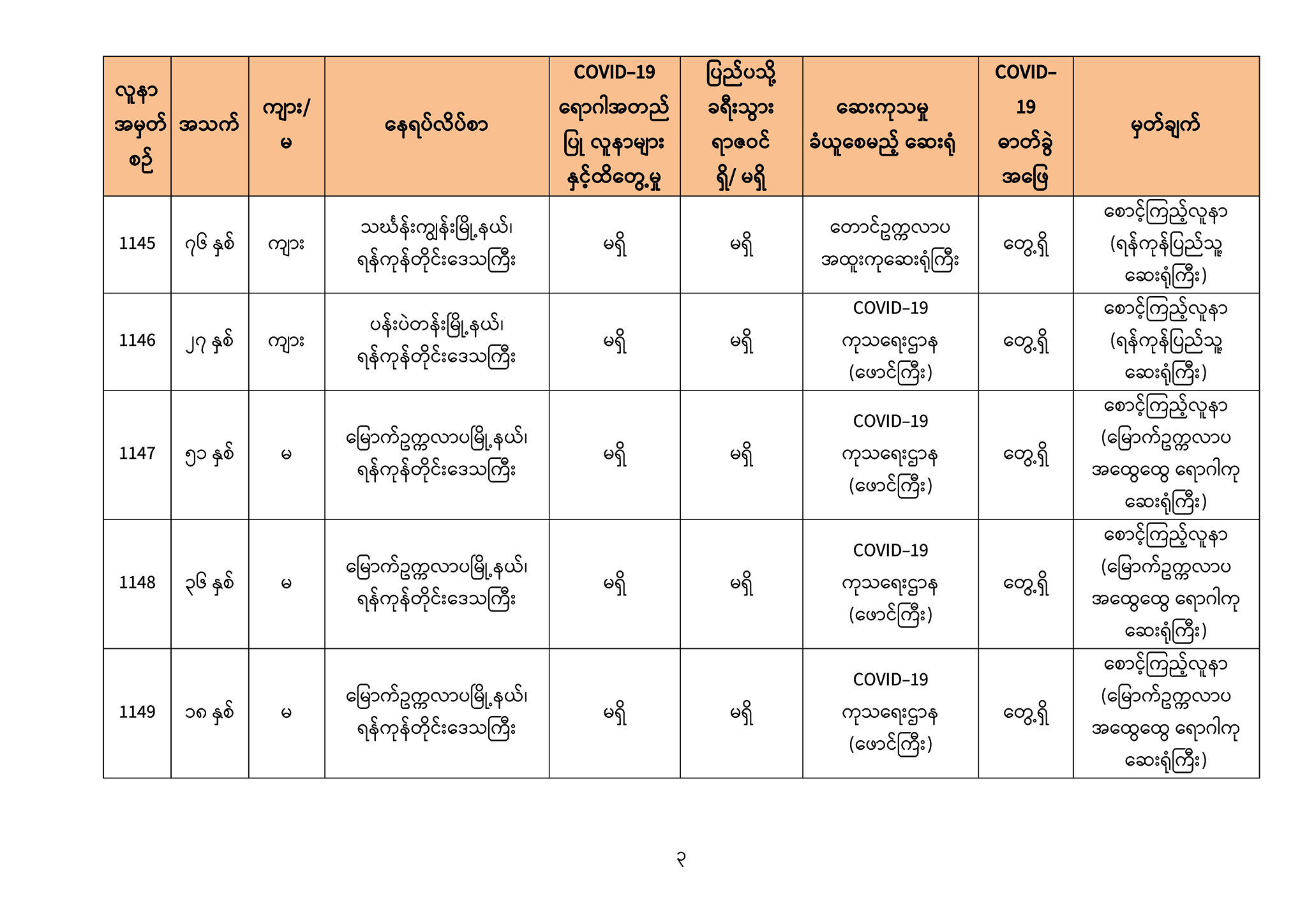 ၃။ ဓာတ်ခွဲအတည်ပြုလူနာသစ်များနှင့် ပတ်သက်သည့် သတင်းအချက်အလက်များကို ပူးတွဲပါဇယားများဖြင့် ဖော်ပြအပ်ပါသည်။