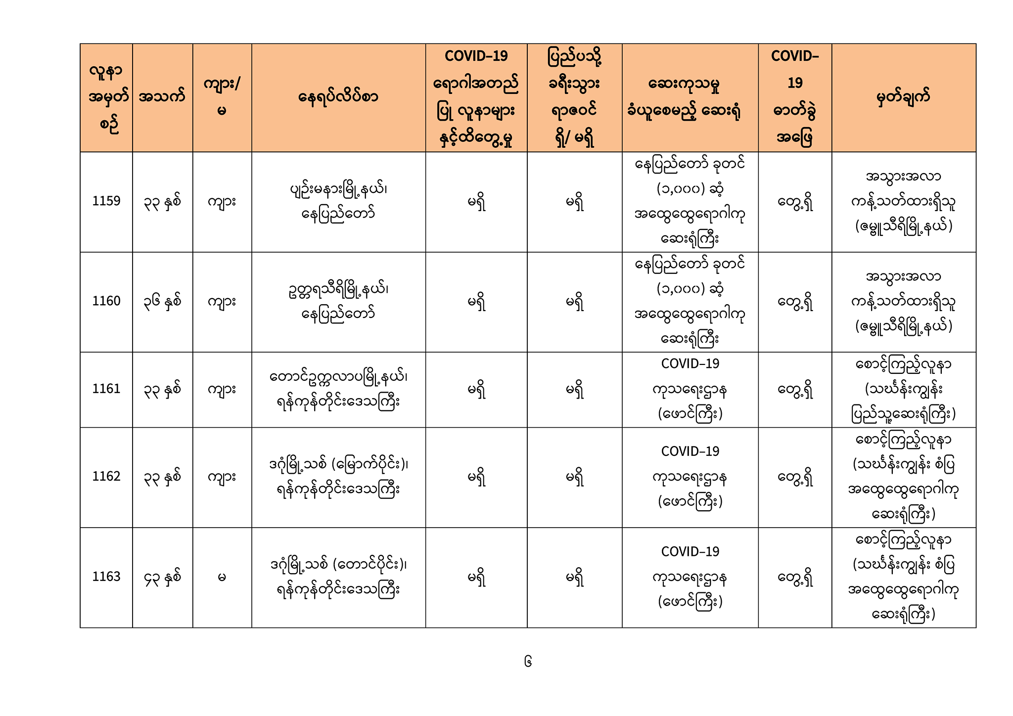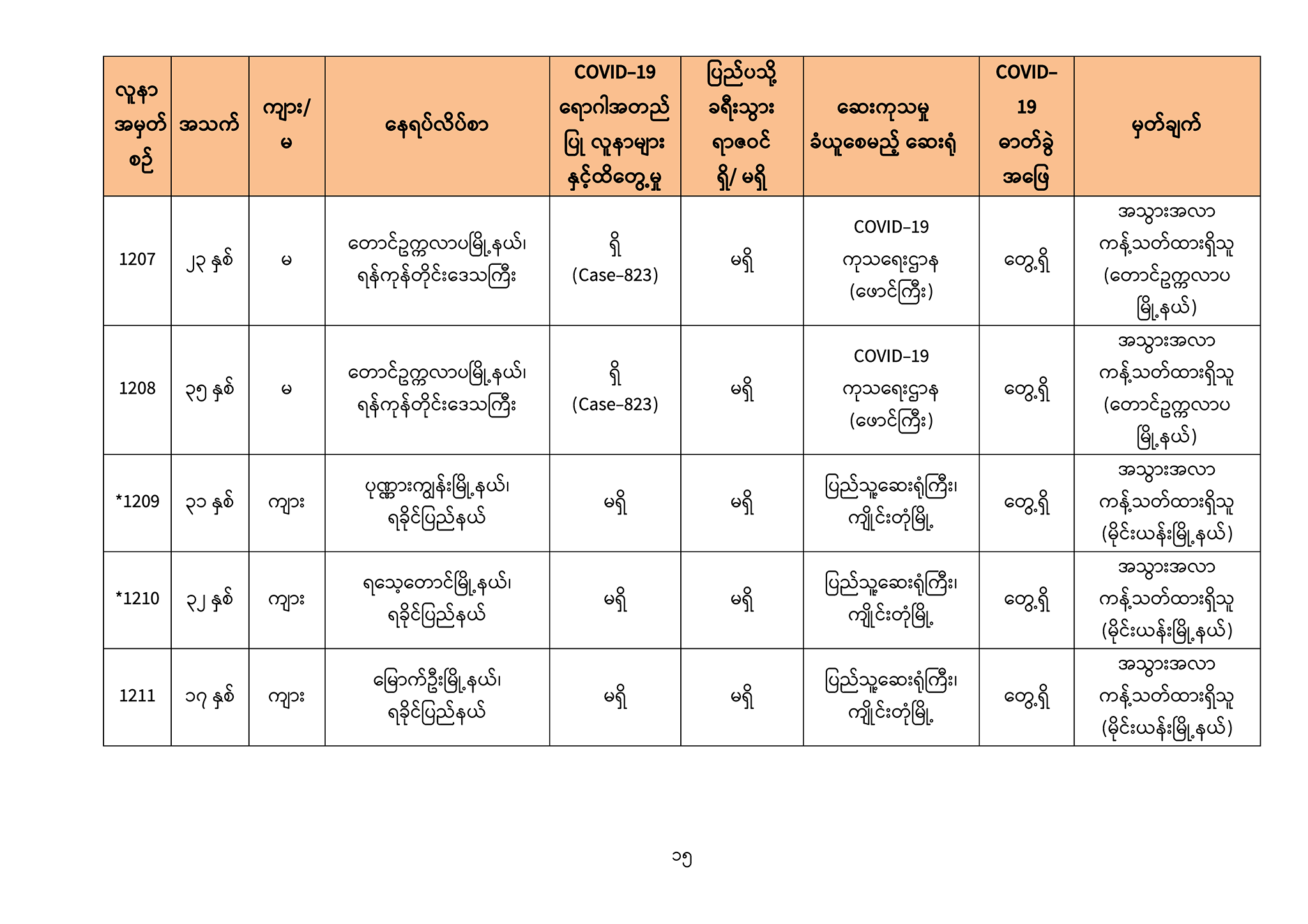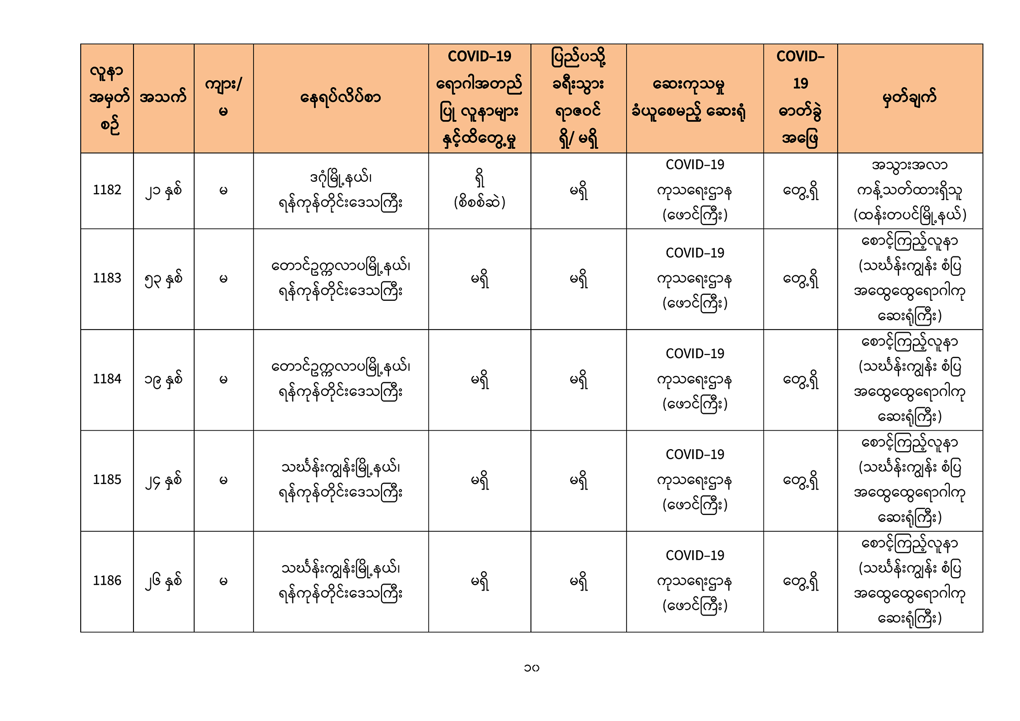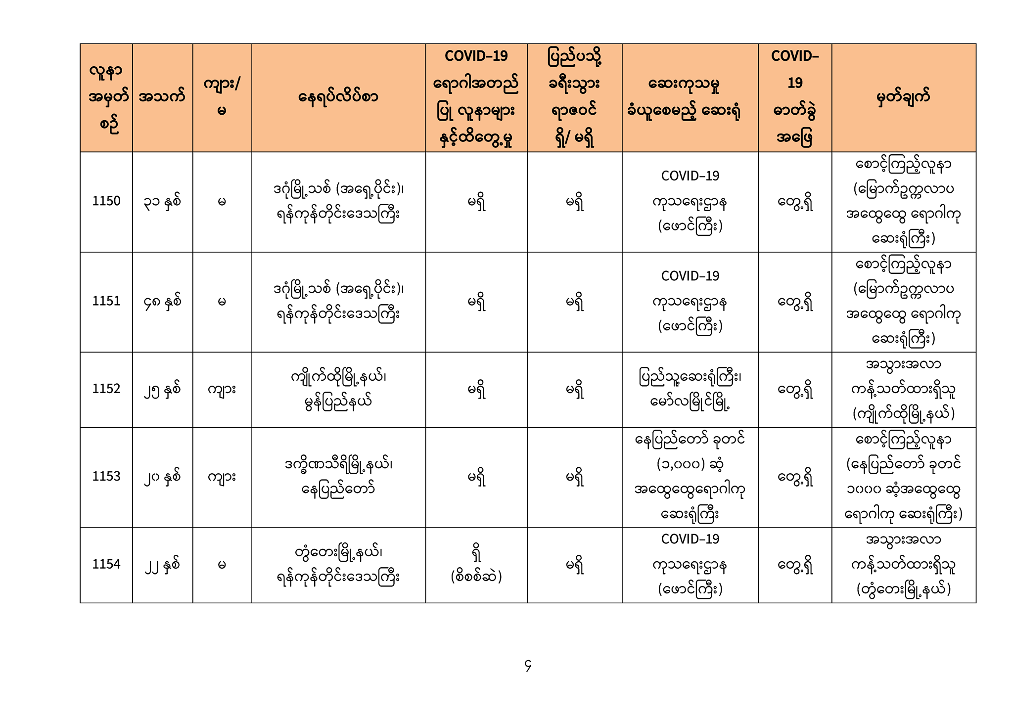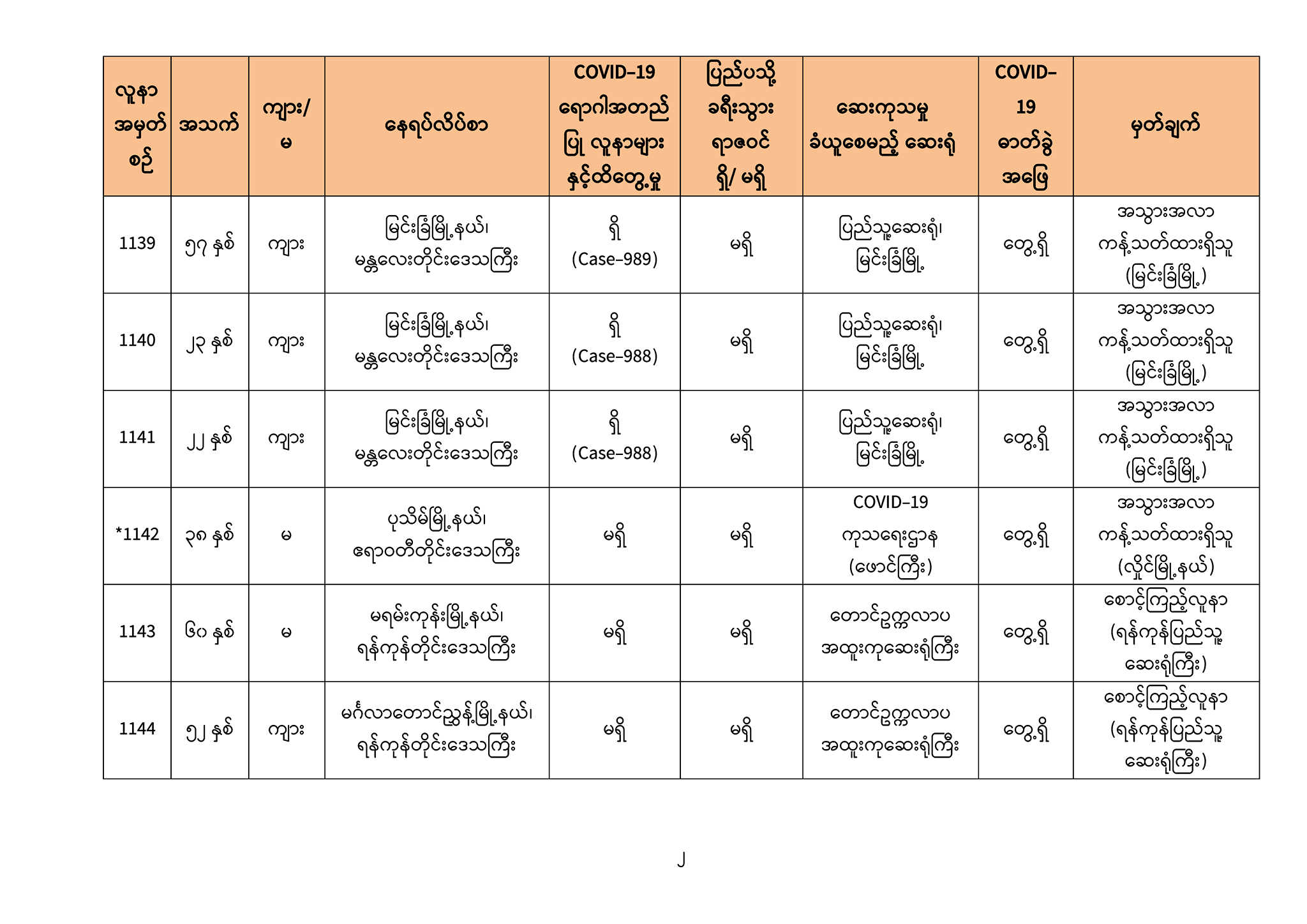 ၃။ ဓာတ်ခွဲအတည်ပြုလူနာသစ်များနှင့် ပတ်သက်သည့် သတင်းအချက်အလက်များကို ပူးတွဲပါဇယားများဖြင့် ဖော်ပြအပ်ပါသည်။
