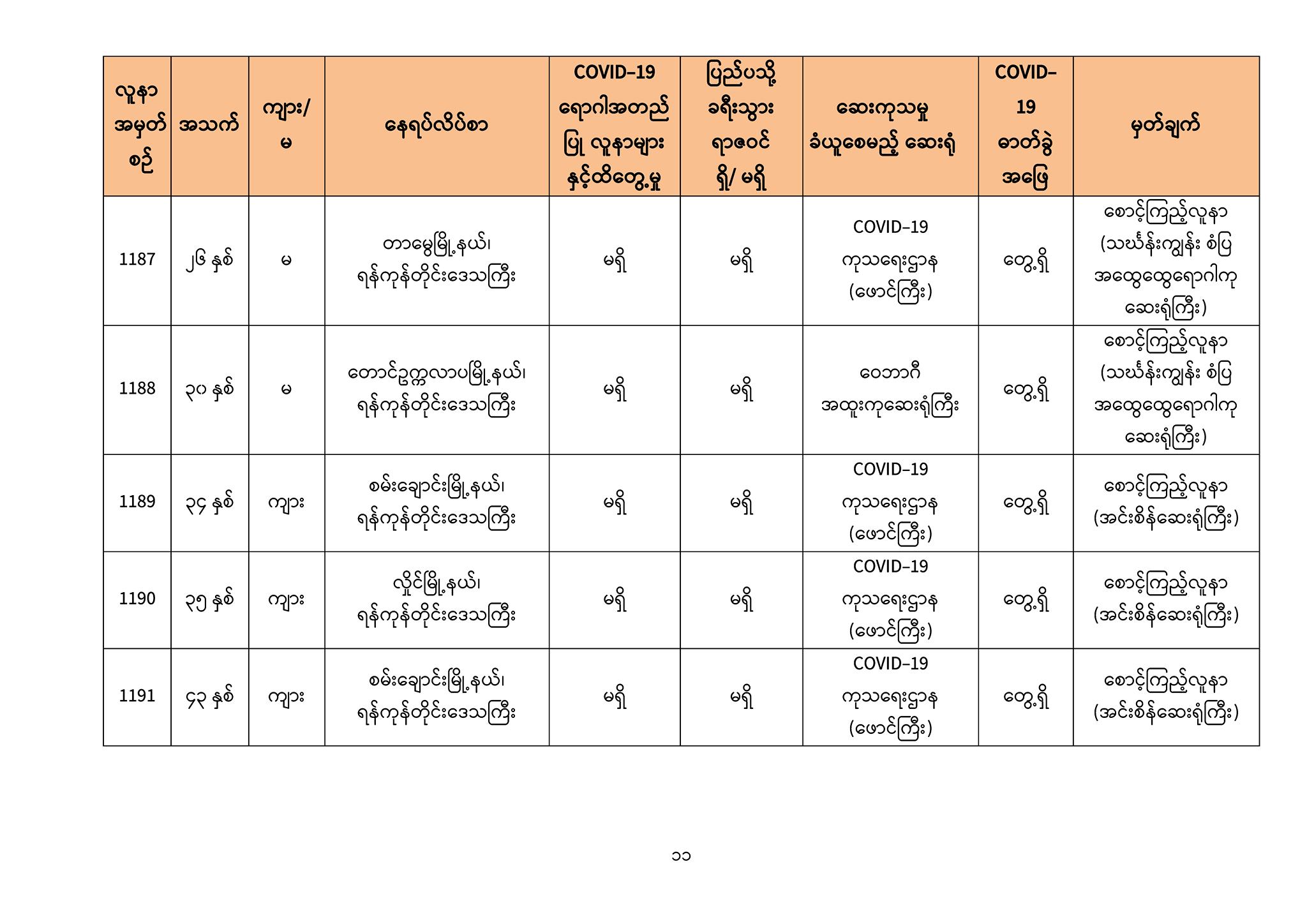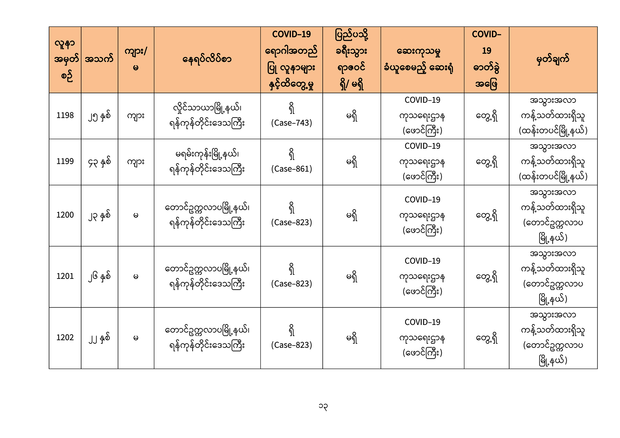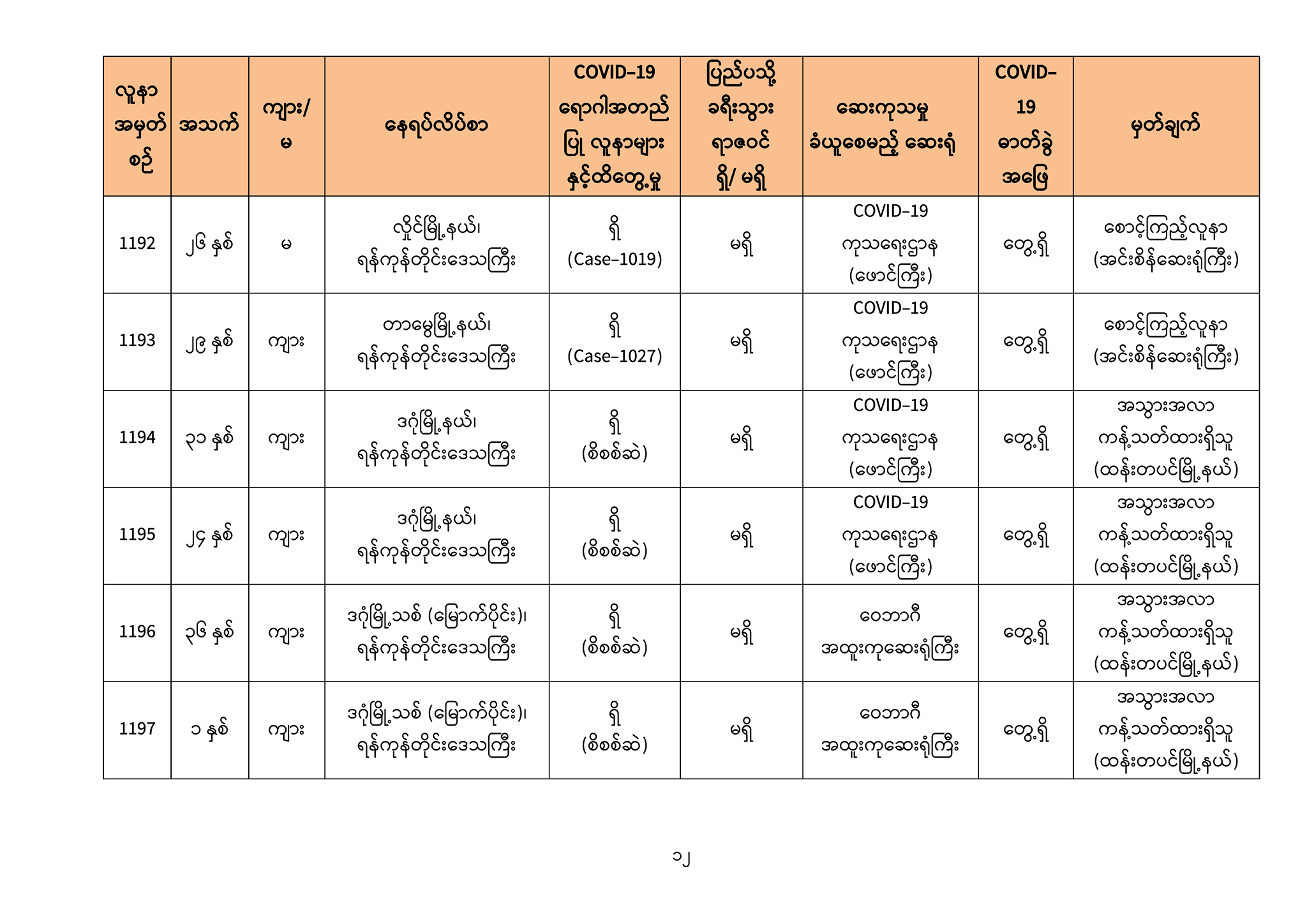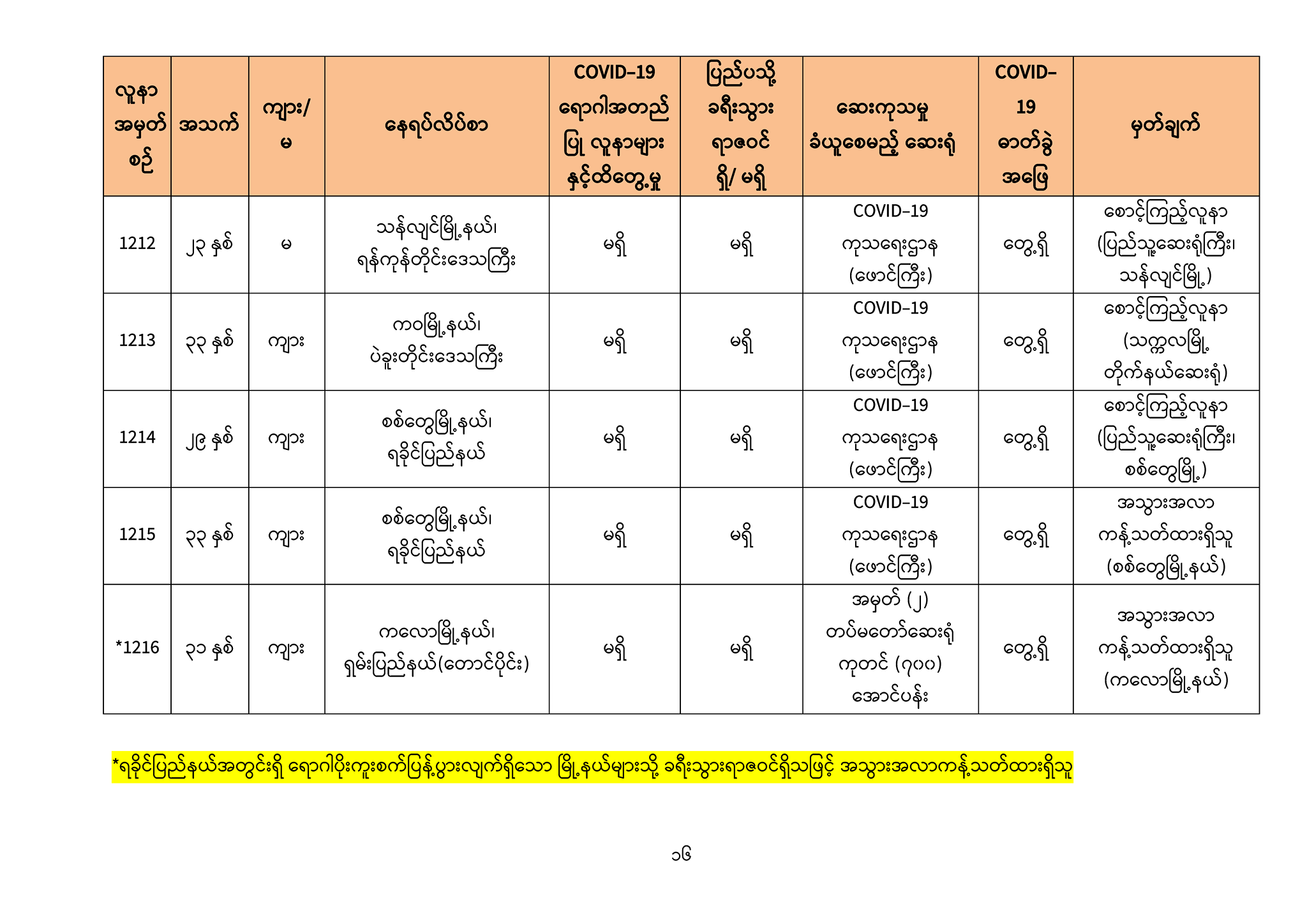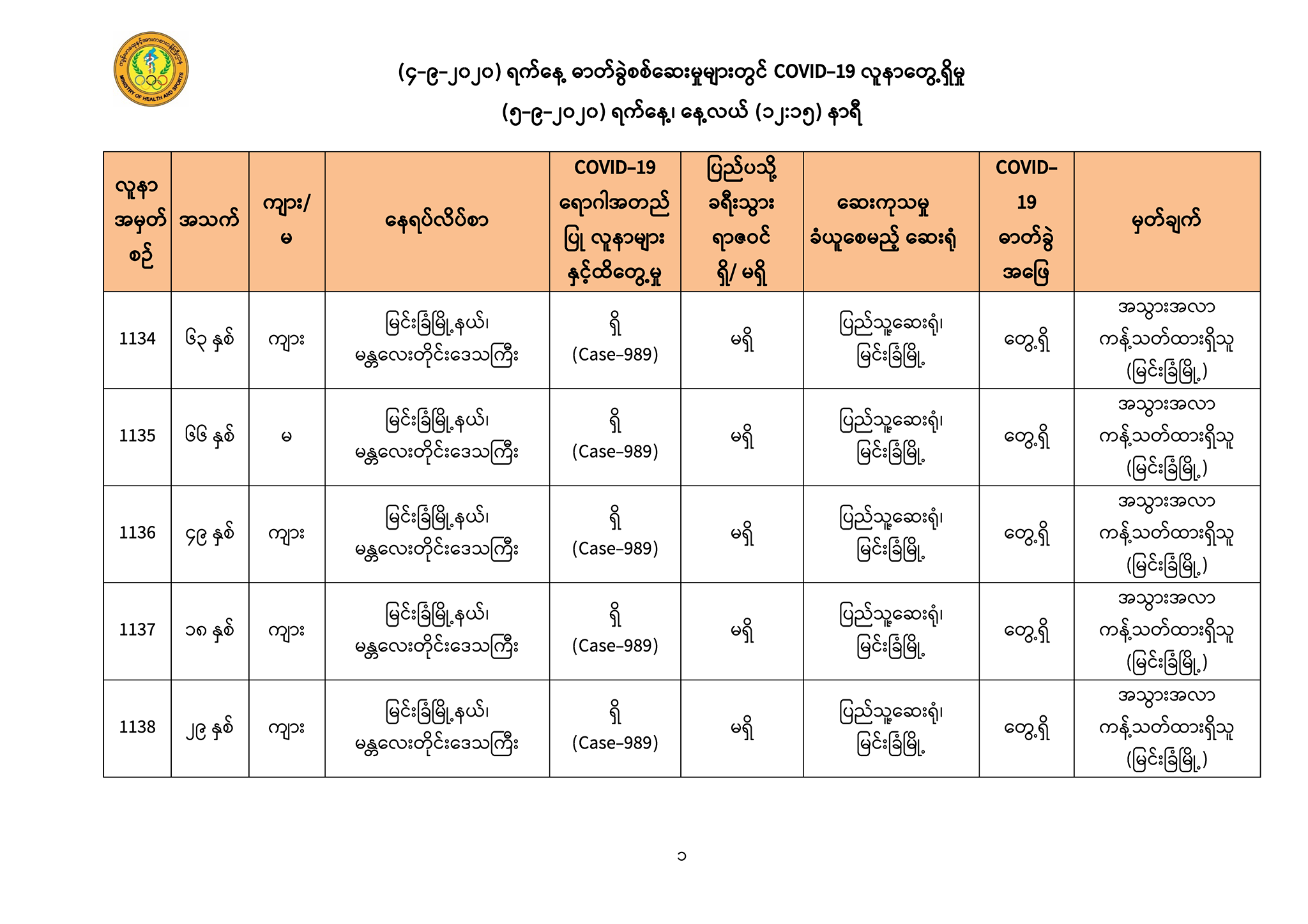 ၂။ (၅-၉-၂၀၂၀) ရက်နေ့၊ နေ့လယ် (၁၂:၁၅) နာရီအထိ မြန်မာနိုင်ငံတွင် COVID-19 ရောဂါ ဓာတ်ခွဲအတည်ပြုလူနာ (၁,၂၁၆)ဦး ရှိပြီဖြစ်ပါသည်။