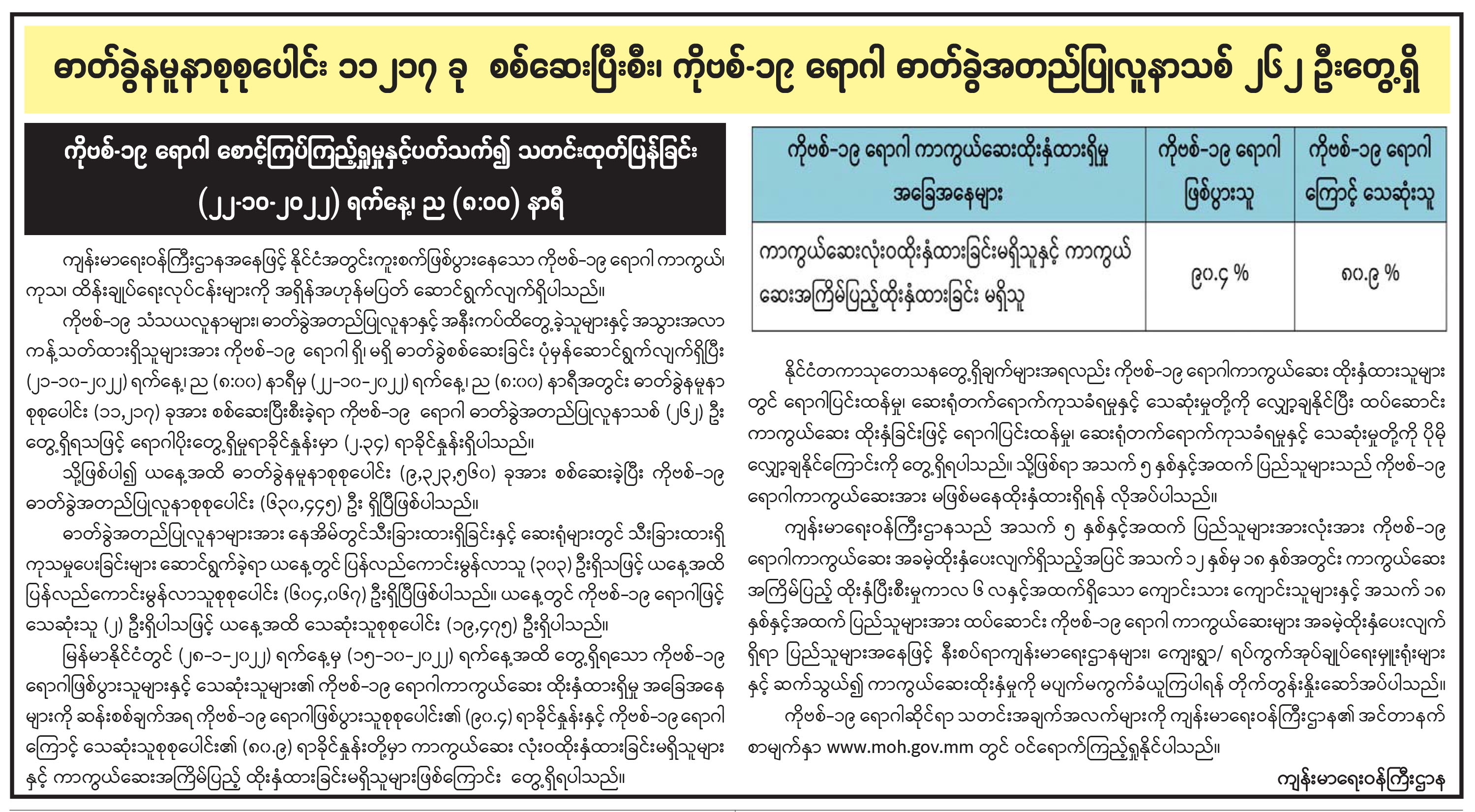 ဓာတ်ခွဲနမူနာစုစုပေါင်း ၁၁၂၁၇ ခု စစ်ဆေးပြီးစီး၊ ကိုဗစ်-၁၉ ရောဂါ ဓာတ်ခွဲအတည်ပြုလူနာသစ် ၂၆၂ ဦးတွေ့ရှိ