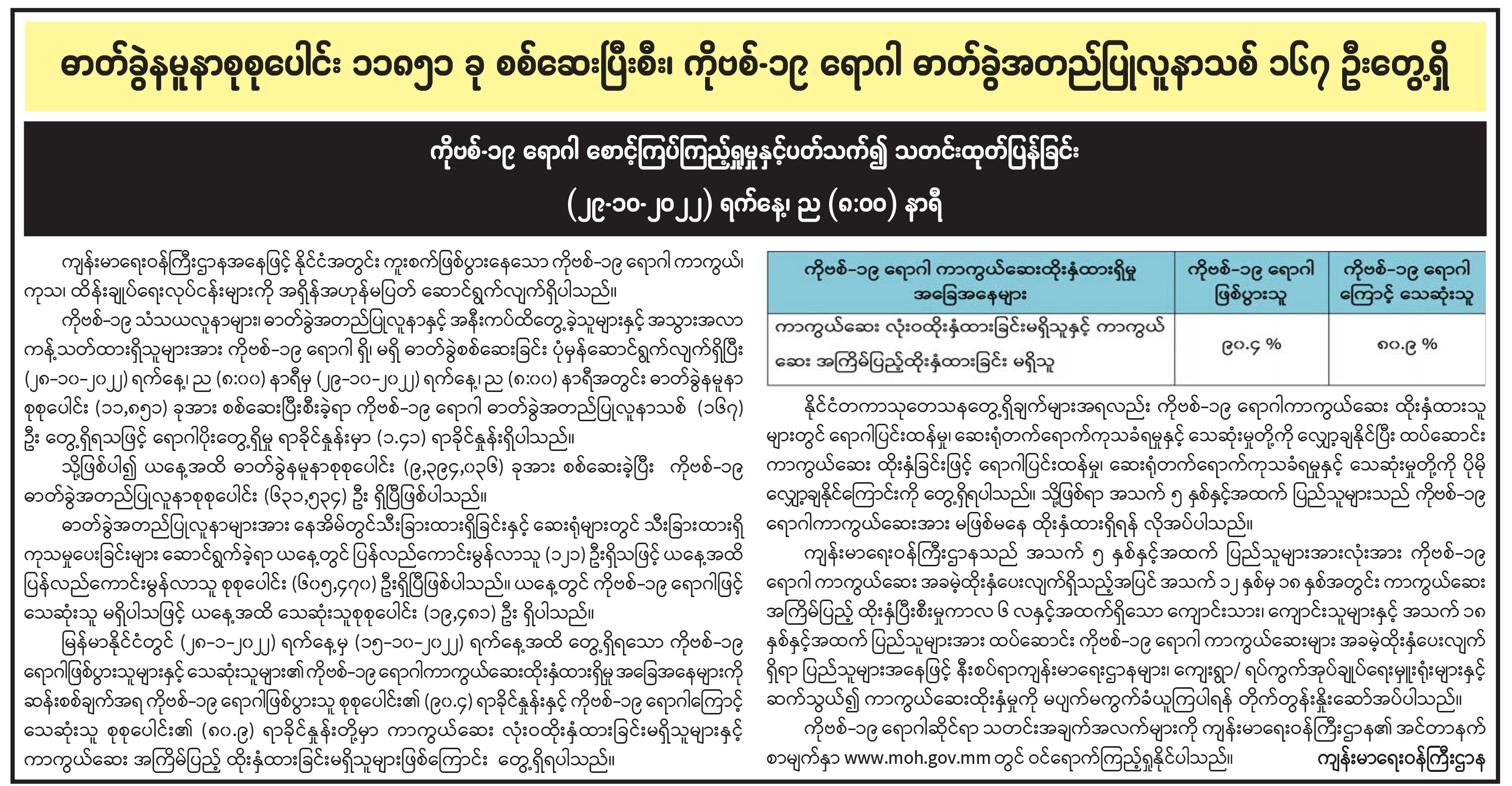 ဓာတ်ခွဲနမူနာစုစုပေါင်း ၁၁၈၅၁ ခု စစ်ဆေးပြီးစီး၊ ကိုဗစ်-၁၉ ရောဂါ ဓာတ်ခွဲအတည်ပြုလူနာသစ် ၁၆၇ ဦးတွေ့ရှိ