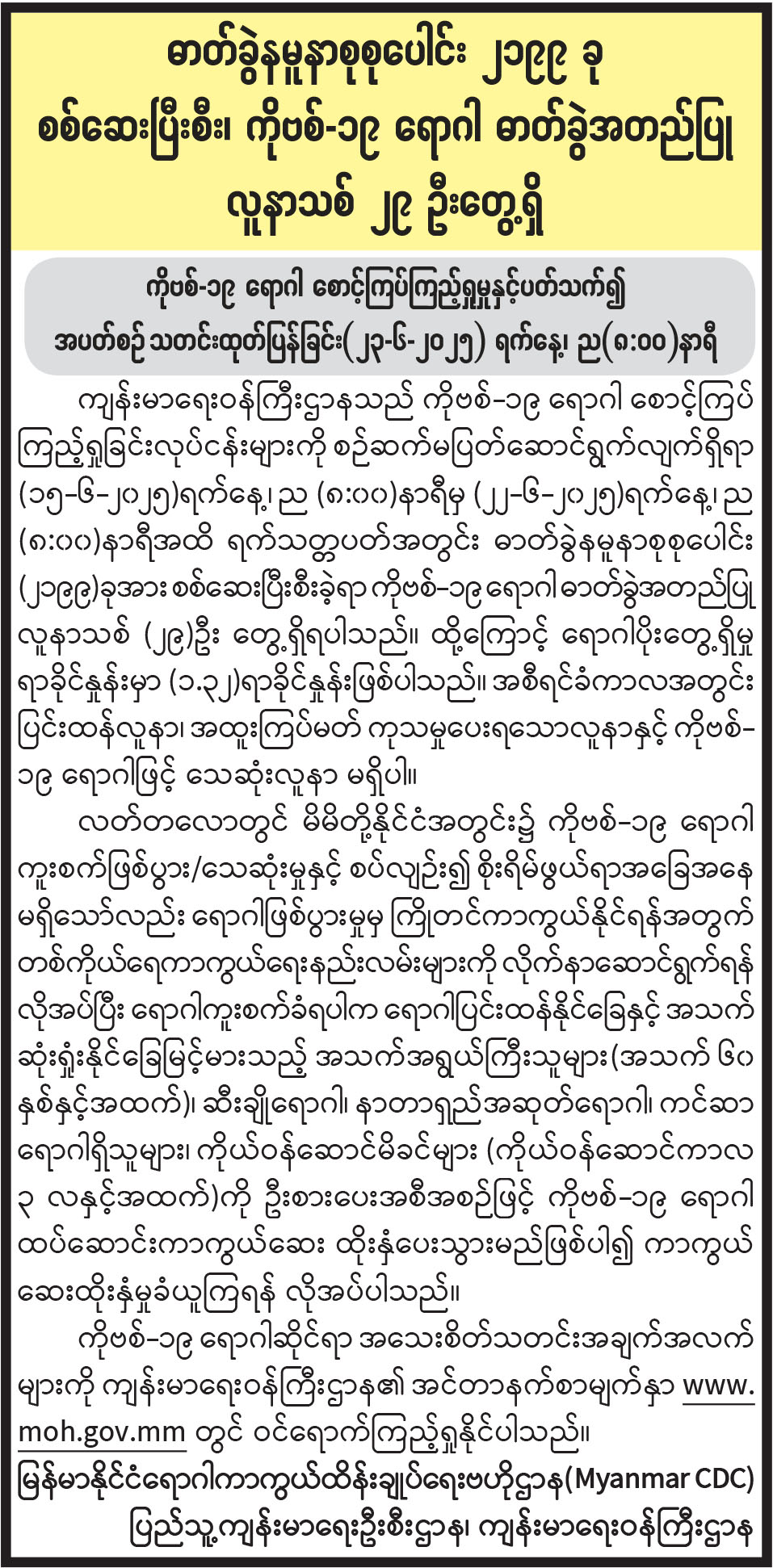 ဓာတ်ခွဲနမူနာစုစုပေါင်း ၂၁၉၉ ခု စစ်ဆေးပြီးစီး၊ ကိုဗစ်-၁၉ ရောဂါ ဓာတ်ခွဲအတည်ပြုလူနာသစ် ၂၉ ဦးတွေ့ရှိ