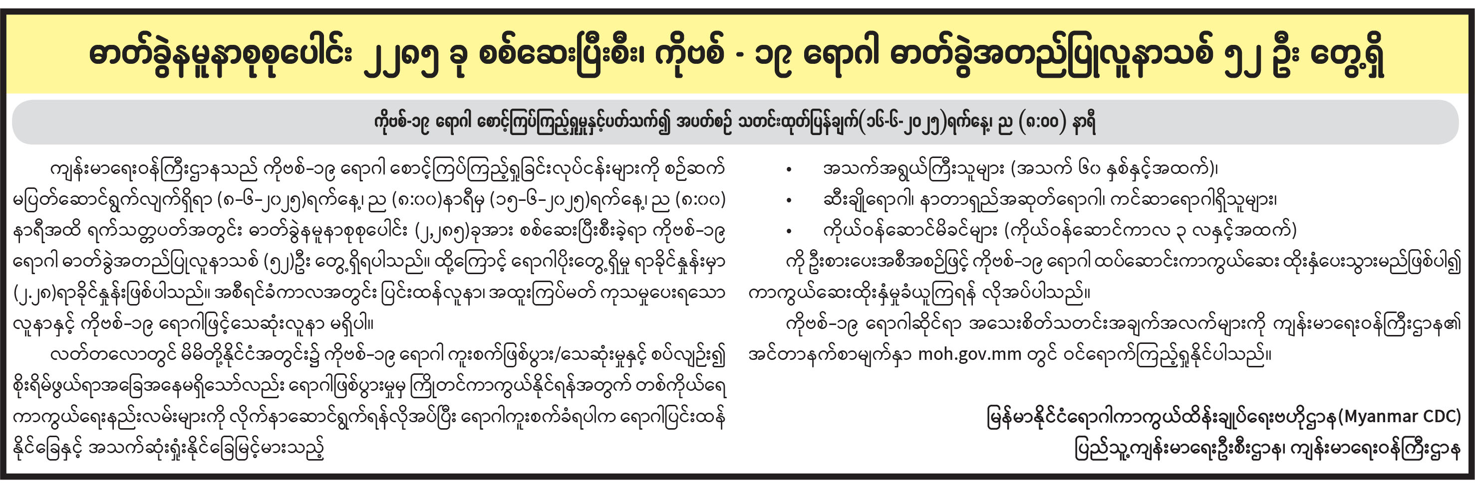 ဓာတ်ခွဲနမူနာစုစုပေါင်း ၂၂၈၅ ခု စစ်ဆေးပြီးစီး၊ ကိုဗစ်-၁၉ ရောဂါ ဓာတ်ခွဲအတည်ပြုလူနာသစ် ၅၂ ဦး တွေ့ရှိ