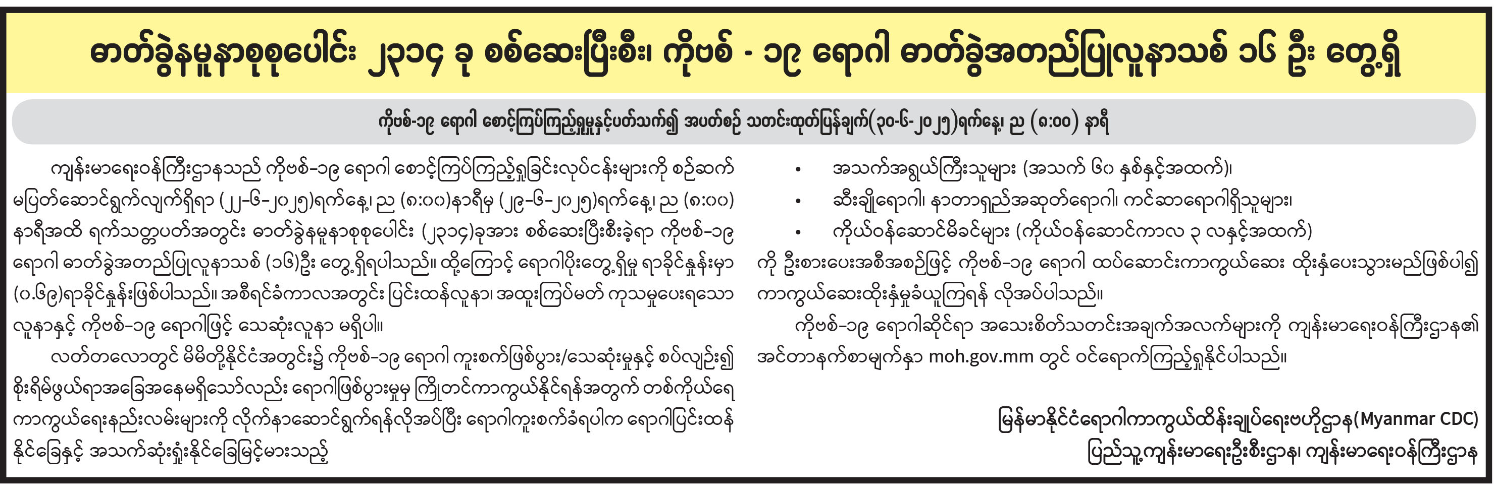 ဓာတ်ခွဲနမူနာစုစုပေါင်း ၂၃၁၄ ခု စစ်ဆေးပြီးစီး၊ ကိုဗစ်-၁၉ ရောဂါ ဓာတ်ခွဲအတည်ပြုလူနာသစ် ၁၆ ဦး တွေ့ရှိ