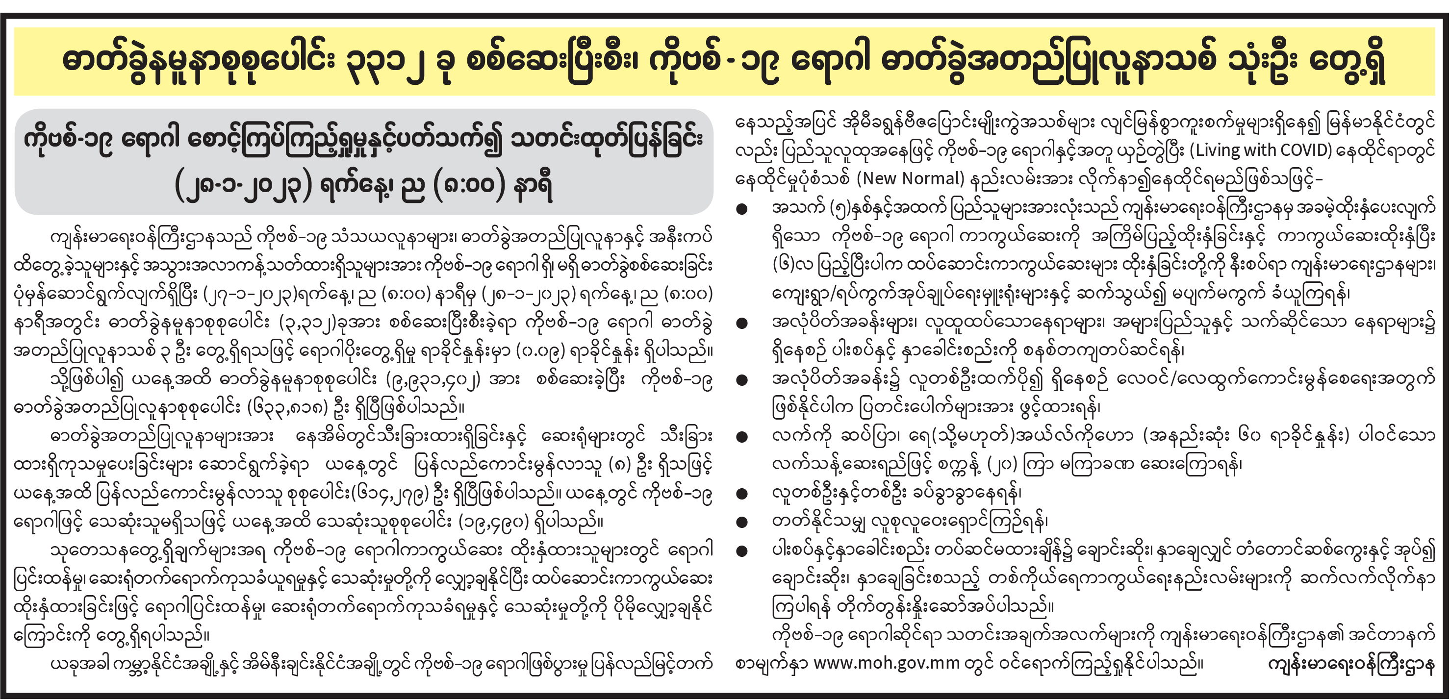 ဓာတ်ခွဲနမူနာစုစုပေါင်း ၃၃၁၂ ခု စစ်ဆေးပြီးစီး၊ ကိုဗစ်-၁၉ ရောဂါ ဓာတ်ခွဲအတည်ပြုလူနာသစ် သုံးဦး တွေ့ရှိ