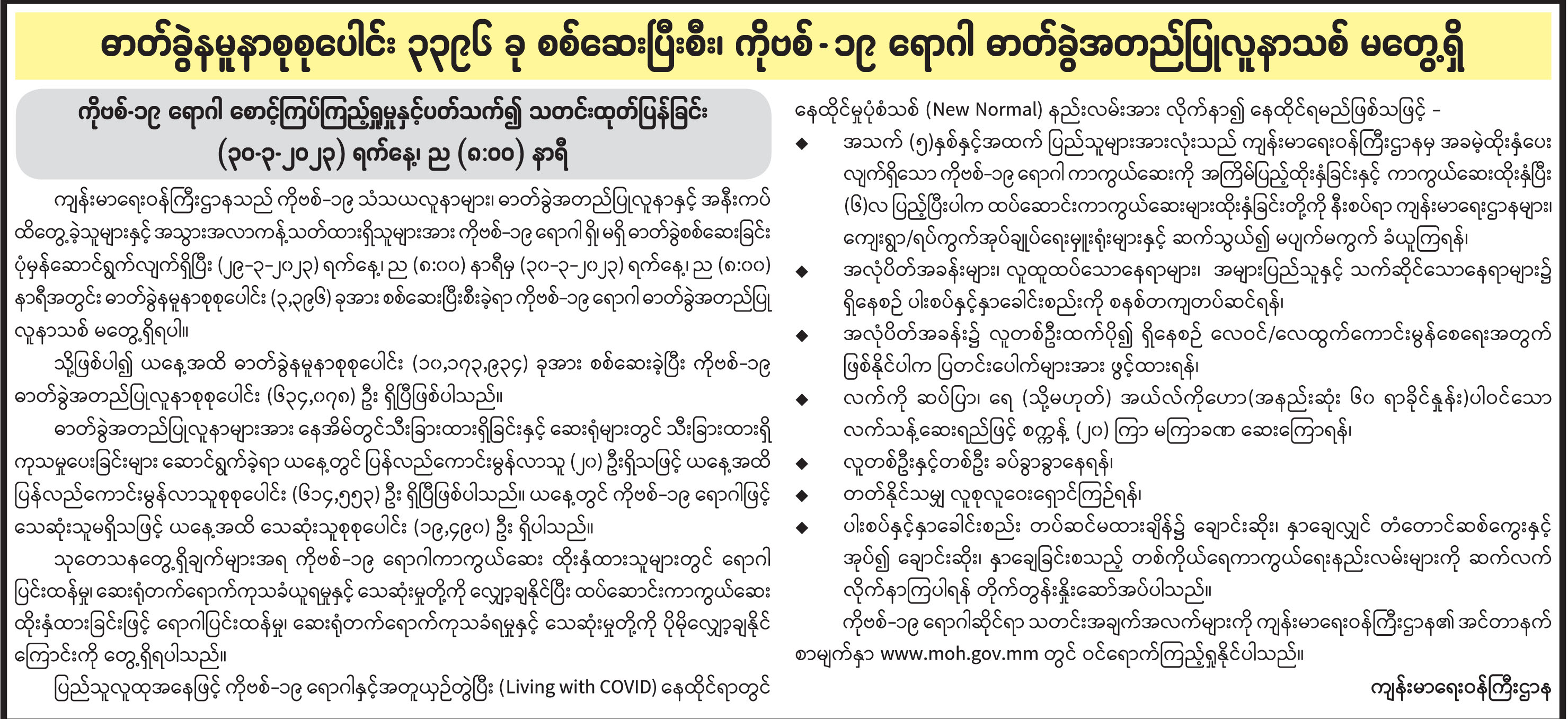 ဓာတ်ခွဲနမူနာစုစုပေါင်း ၃၃၉၆ ခု စစ်ဆေးပြီးစီး၊ ကိုဗစ်-၁၉ ရောဂါ ဓာတ်ခွဲအတည်ပြုလူနာသစ် မတွေ့ရှိ