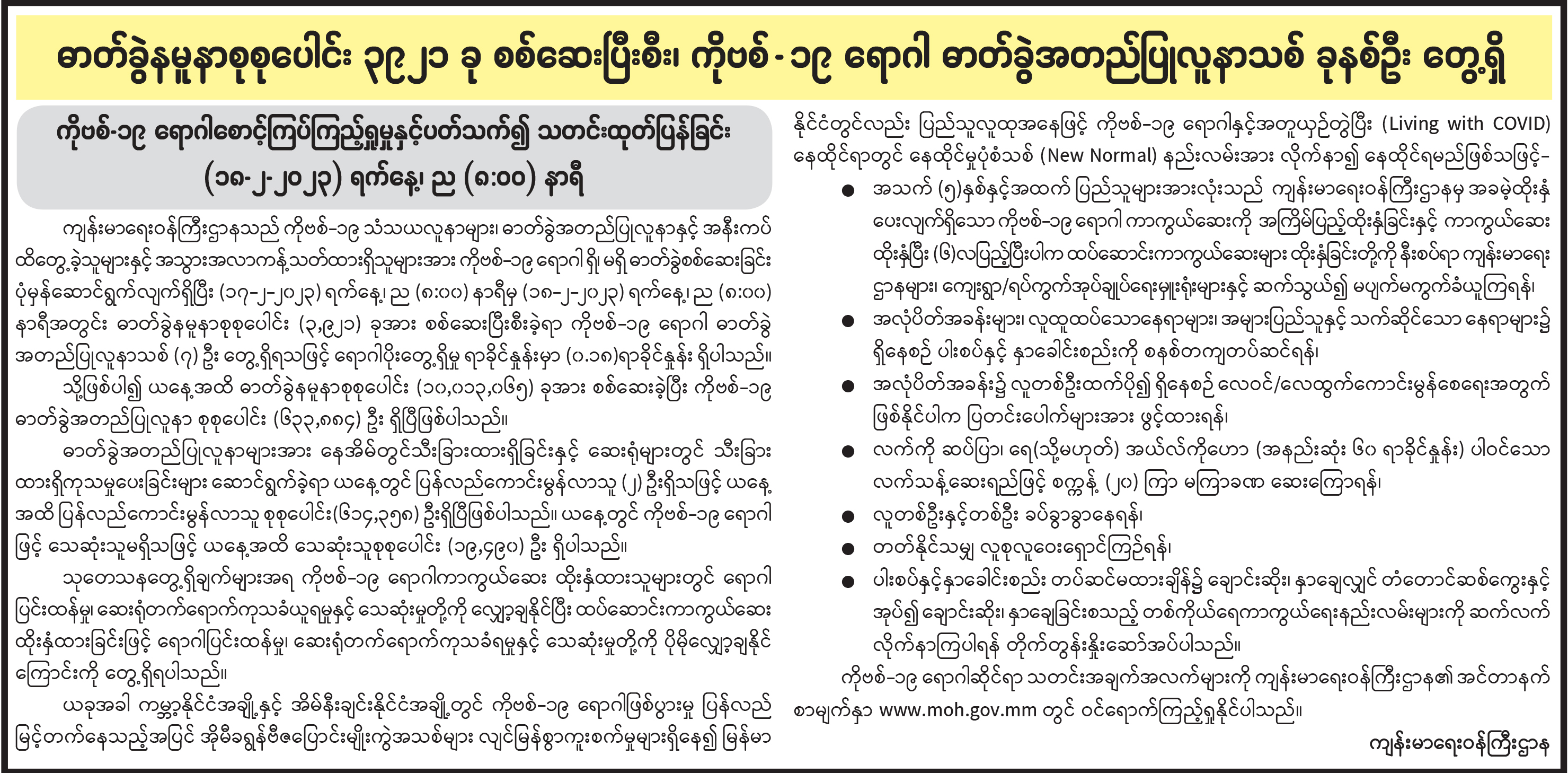 ဓာတ်ခွဲနမူနာစုစုပေါင်း ၃၉၂၁ ခု စစ်ဆေးပြီးစီး၊ ကိုဗစ်-၁၉ ရောဂါ ဓာတ်ခွဲအတည်ပြုလူနာသစ် ခုနစ်ဦး တွေ့ရှိ