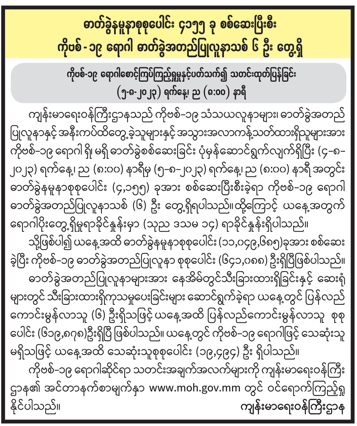 ဓာတ်ခွဲနမူနာစုစုပေါင်း ၄၁၅၅ ခု စစ်ဆေးပြီးစီး ကိုဗစ်-၁၉ ရောဂါ ဓာတ်ခွဲအတည်ပြုလူနာသစ် ၆ ဦး တွေ့ရှိ
