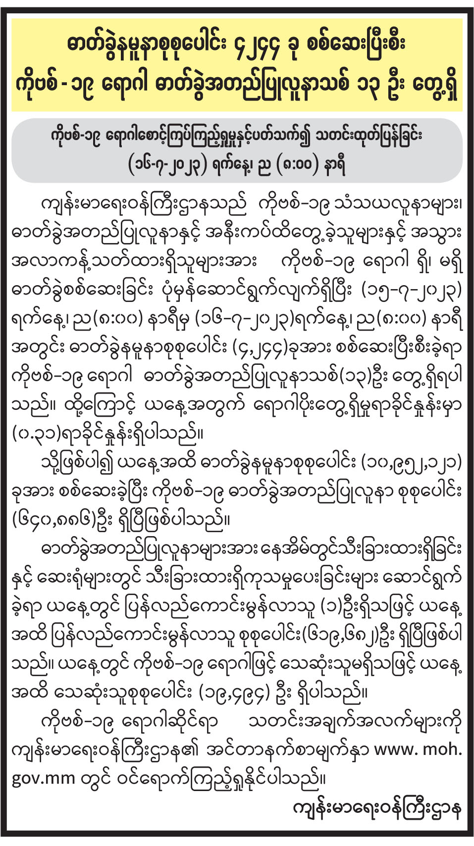 ဓာတ်ခွဲနမူနာစုစုပေါင်း ၄၂၄၄ ခု စစ်ဆေးပြီးစီး ကိုဗစ်-၁၉ ရောဂါ ဓာတ်ခွဲအတည်ပြုလူနာသစ် ၁၃ ဦး တွေ့ရှိ