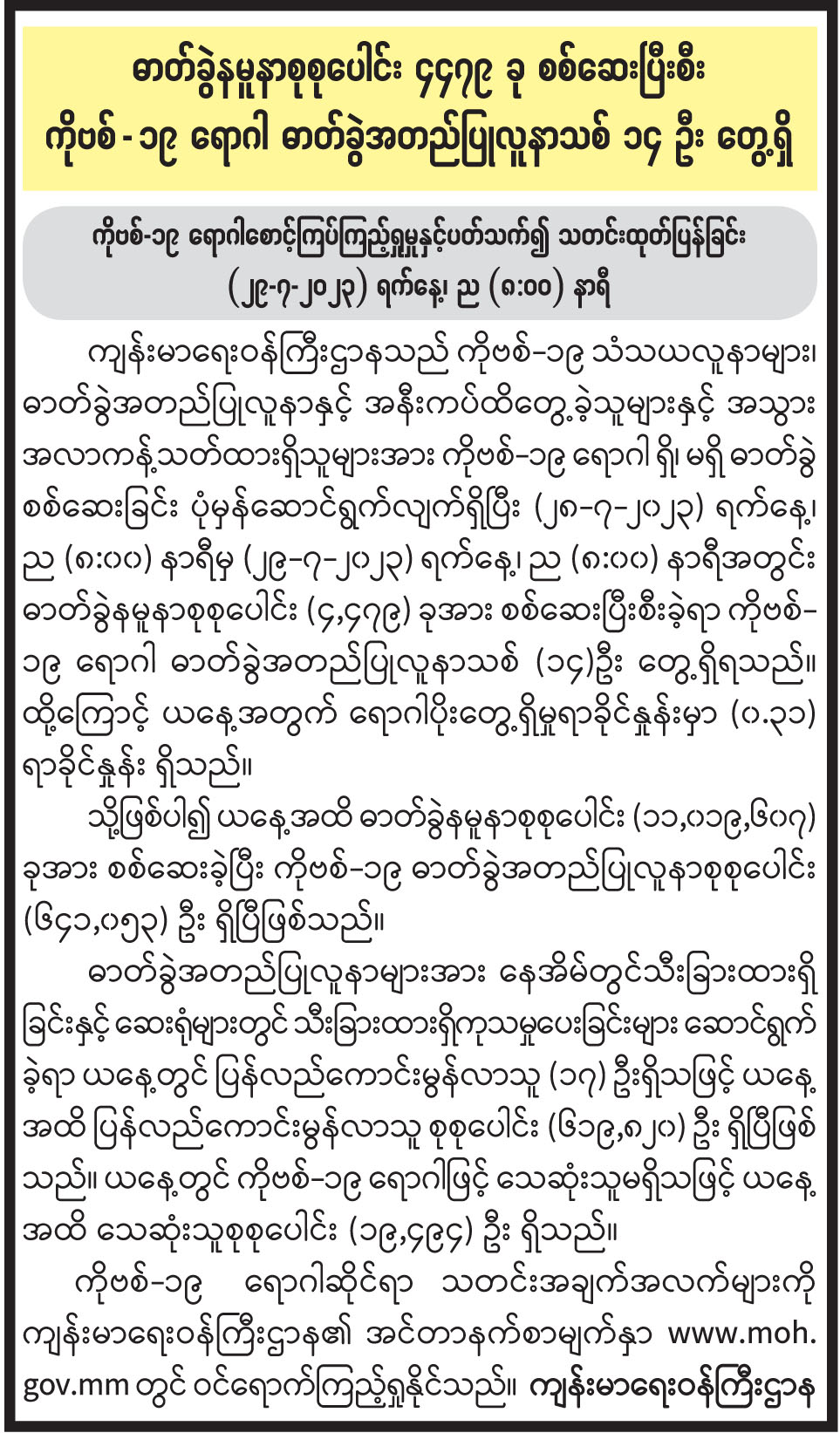 ဓာတ်ခွဲနမူနာစုစုပေါင်း ၄၄၇၉ ခု စစ်ဆေးပြီးစီး ကိုဗစ်-၁၉ ရောဂါ ဓာတ်ခွဲအတည်ပြုလူနာသစ် ၁၄ ဦး တွေ့ရှိ