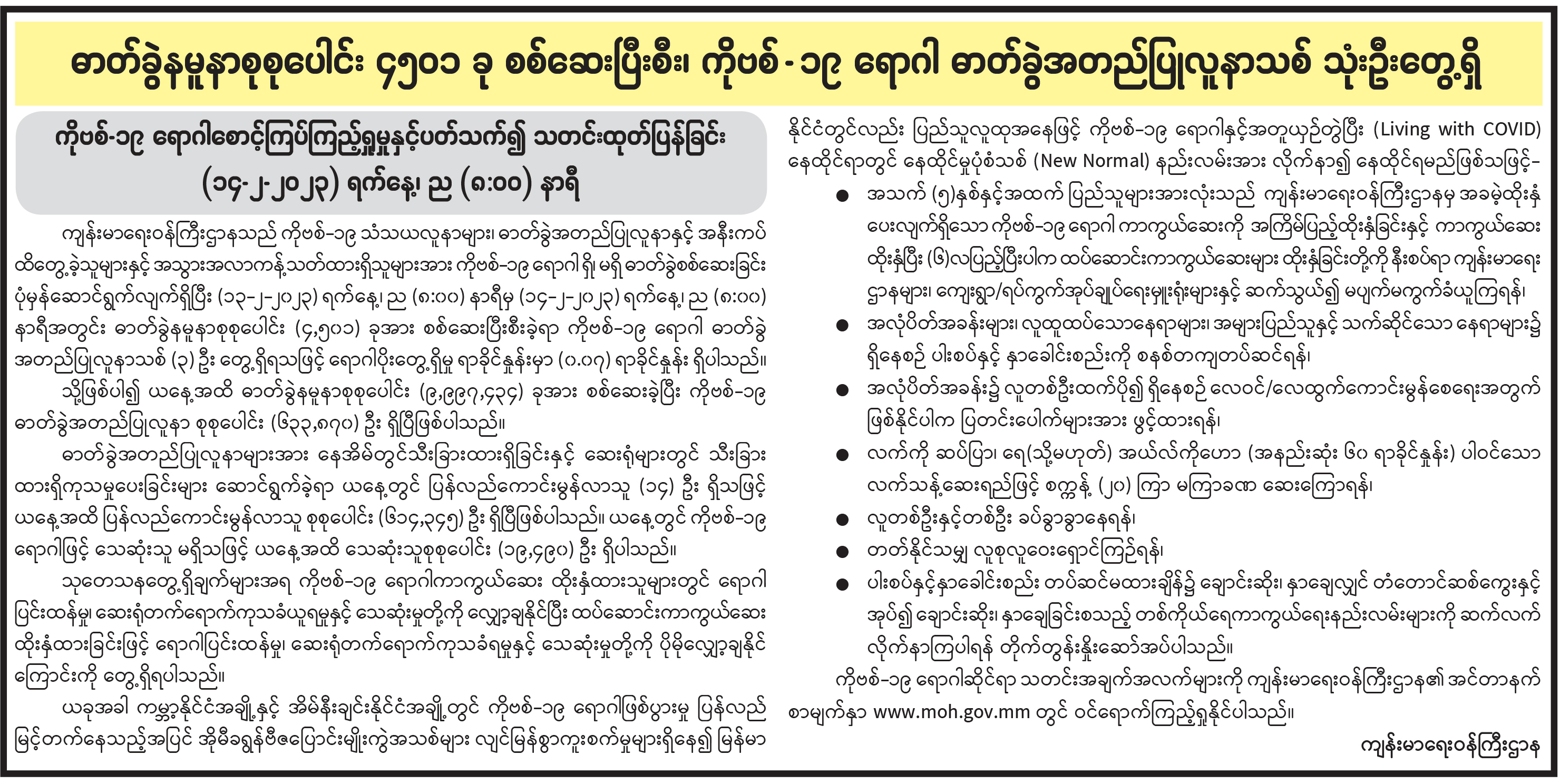 ဓာတ်ခွဲနမူနာစုစုပေါင်း ၄၅၀၁ ခု စစ်ဆေးပြီးစီး၊ ကိုဗစ်-၁၉ ရောဂါ ဓာတ်ခွဲအတည်ပြုလူနာသစ် သုံးဦးတွေ့ရှိ
