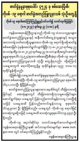 ဓာတ်ခွဲနမူနာစုစုပေါင်း ၄၅၂၄ ခု စစ်ဆေးပြီးစီး ကိုဗစ်-၁၉ ရောဂါ ဓာတ်ခွဲအတည်ပြုလူနာသစ် သုံးဦးတွေ့ရှိ