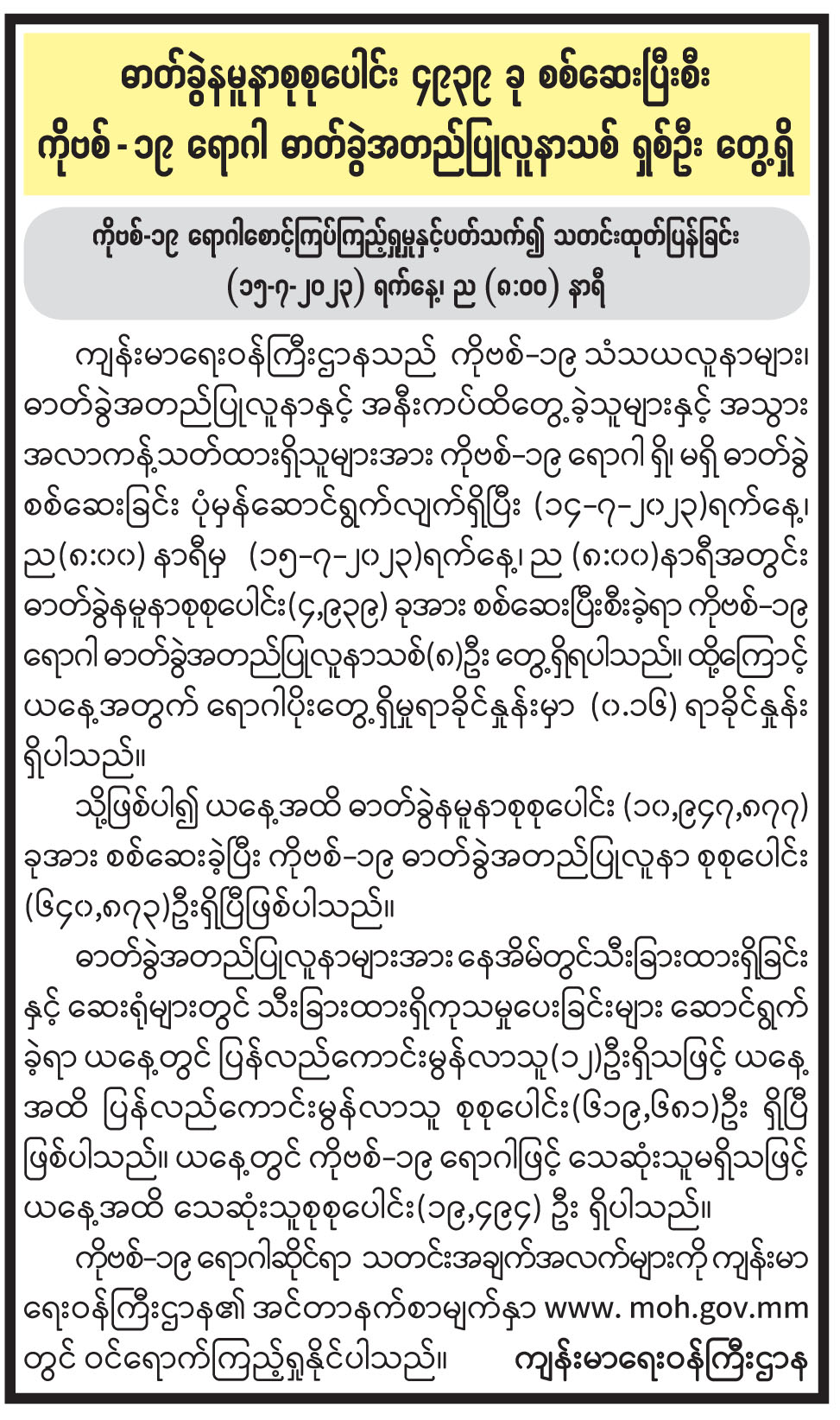 ဓာတ်ခွဲနမူနာစုစုပေါင်း ၄၉၃၉ ခု စစ်ဆေးပြီးစီး ကိုဗစ်-၁၉ ရောဂါ ဓာတ်ခွဲအတည်ပြုလူနာသစ် ရှစ်ဦး တွေ့ရှိ