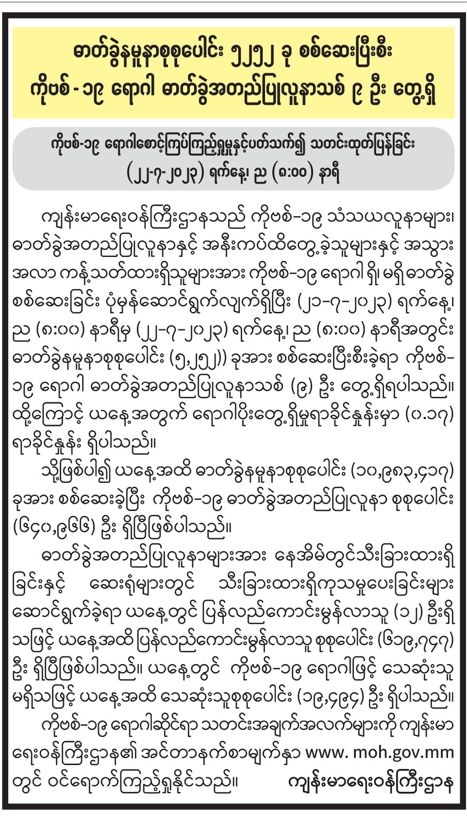 ဓာတ်ခွဲနမူနာစုစုပေါင်း ၅၂၅၂ ခု စစ်ဆေးပြီးစီး ကိုဗစ်-၁၉ ရောဂါ ဓာတ်ခွဲအတည်ပြုလူနာသစ် ၉ ဦး တွေ့ရှိ