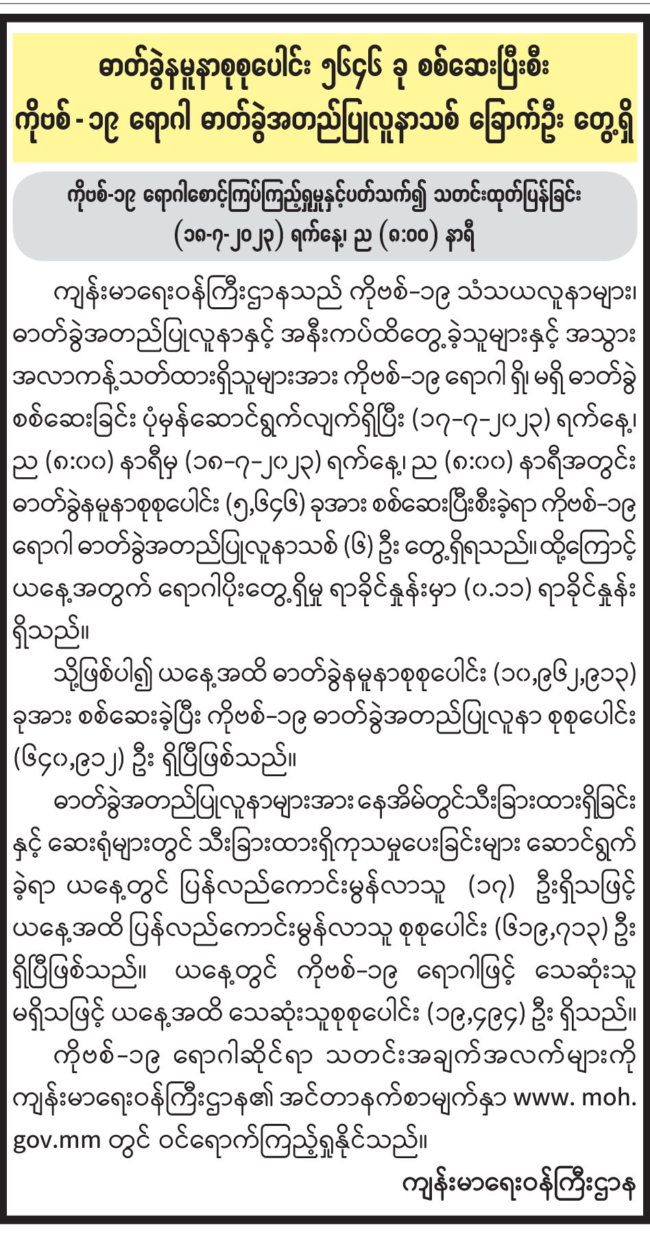 ဓာတ်ခွဲနမူနာစုစုပေါင်း ၅၆၄၆ ခု စစ်ဆေးပြီးစီး ကိုဗစ်-၁၉ ရောဂါ ဓာတ်ခွဲအတည်ပြုလူနာသစ် ခြောက်ဦး တွေ့ရှိ